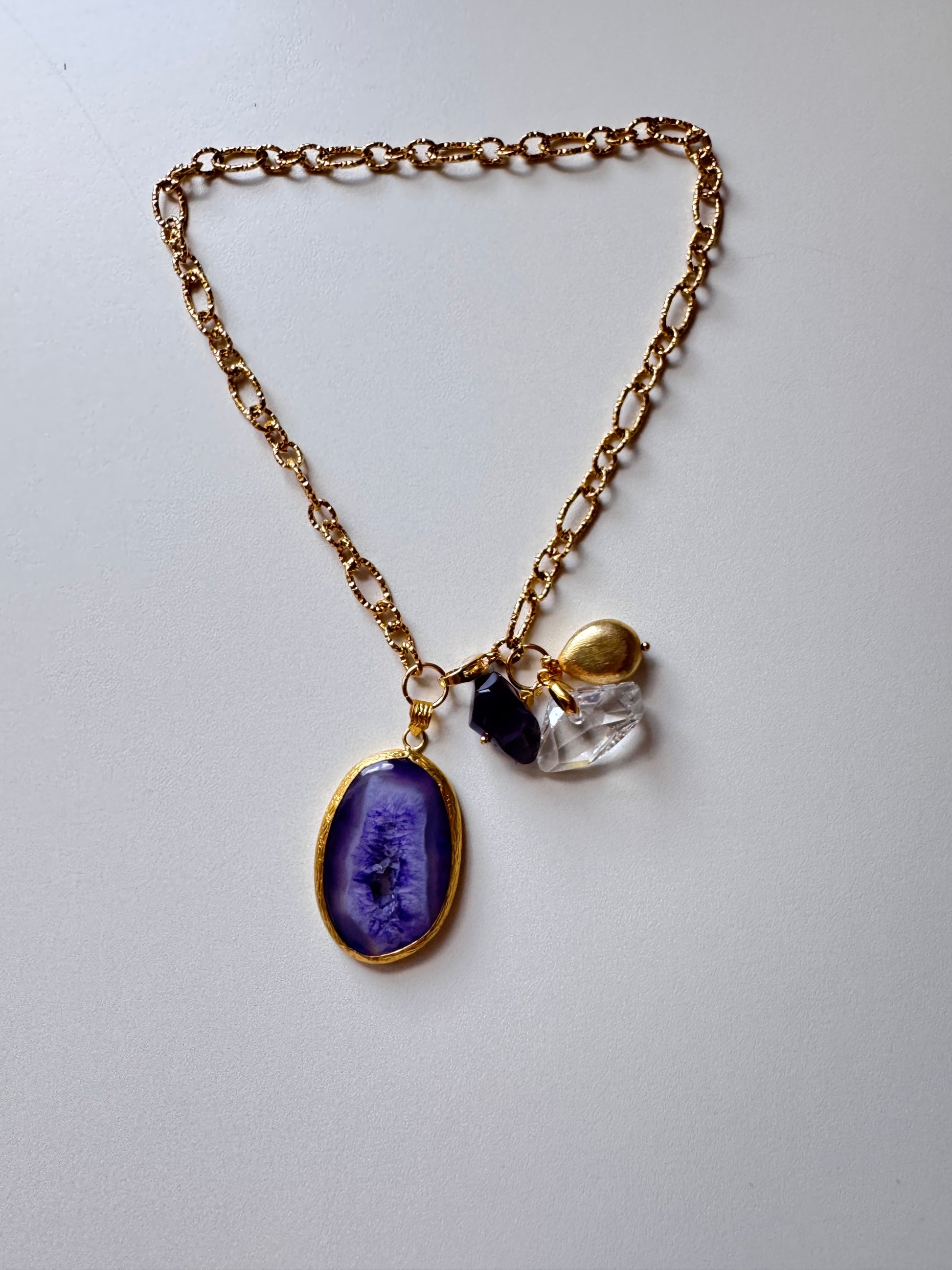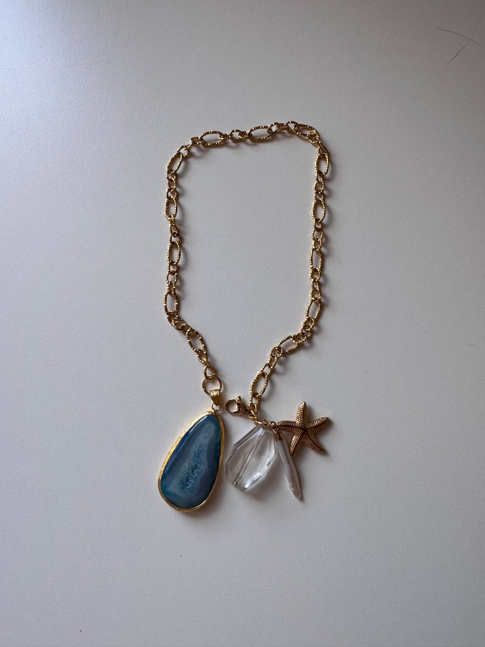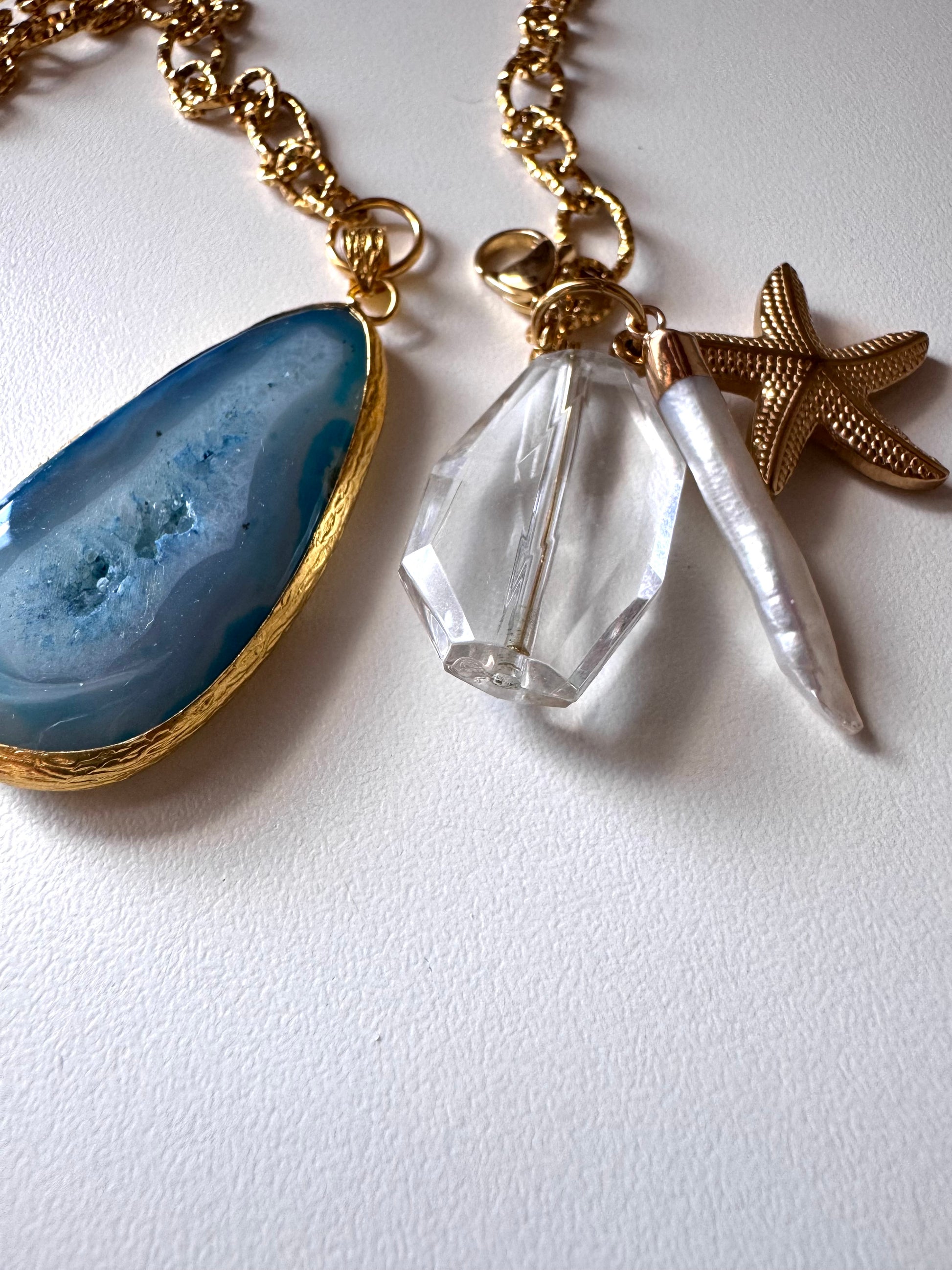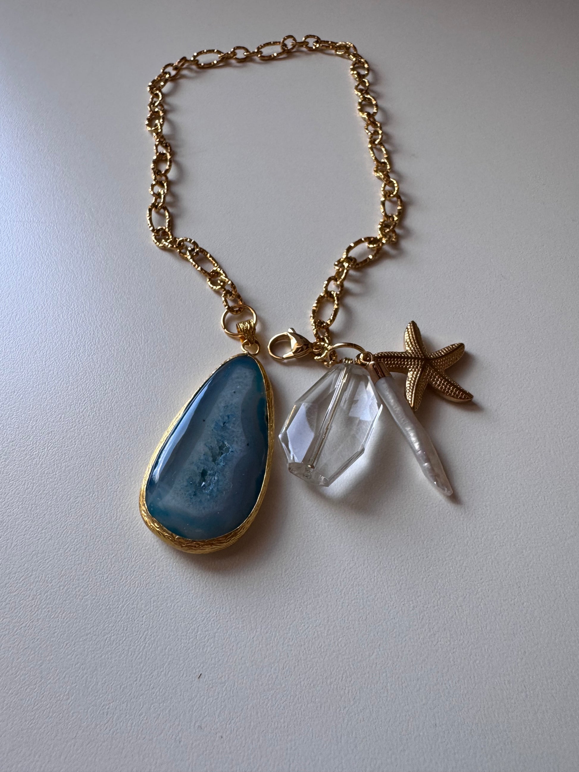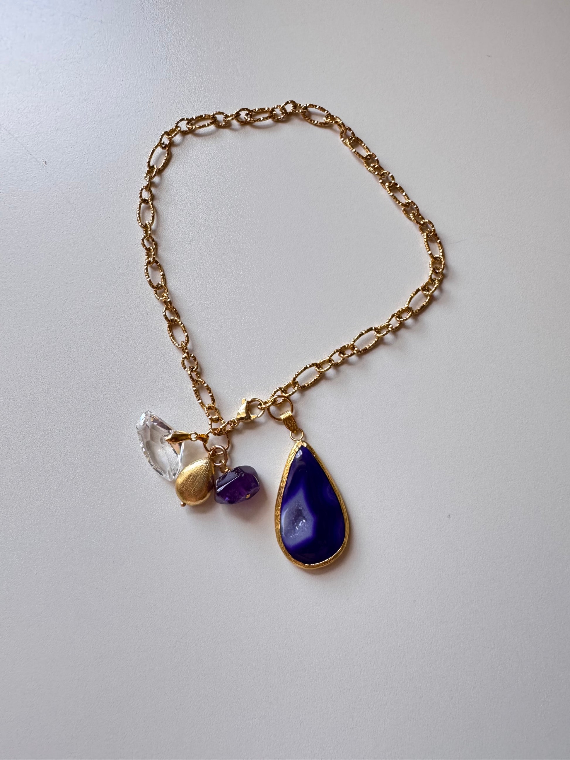 Un’agata colorata come punto focale, una catena in acciaio inossidabile (che non scolorisce!) e una composizione di charms che cambia a seconda della variante.
