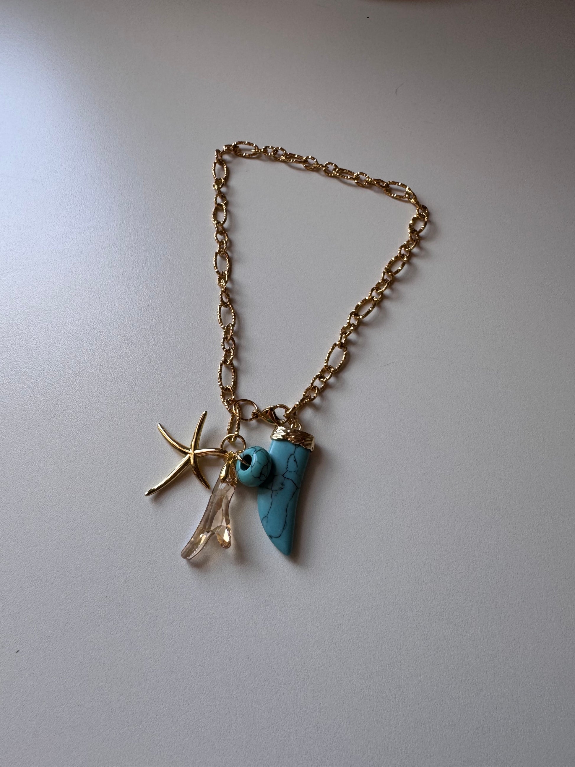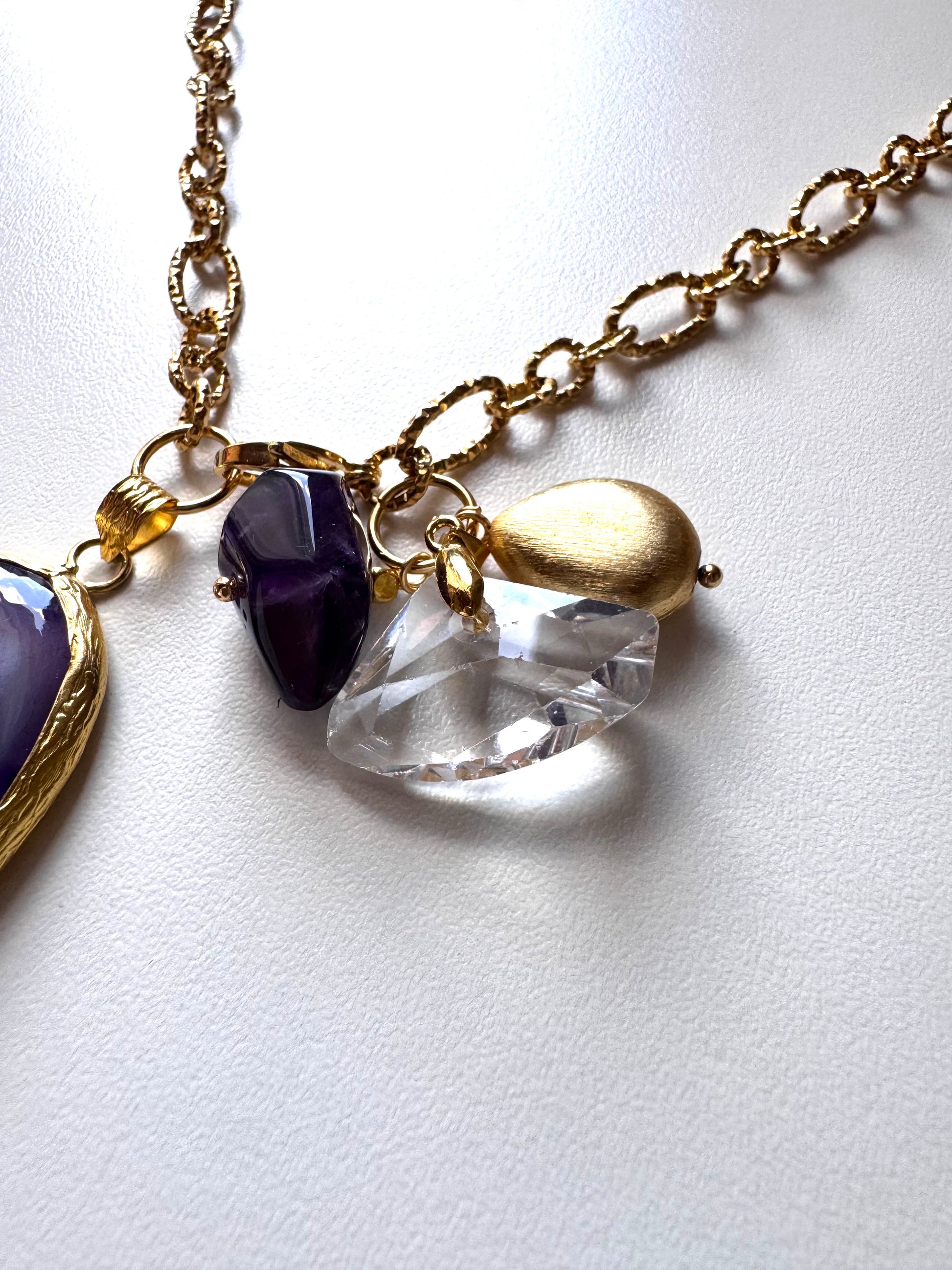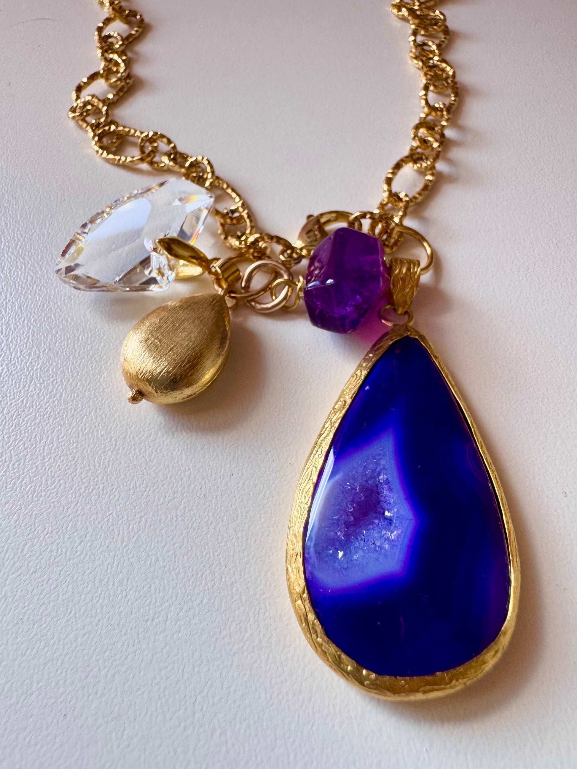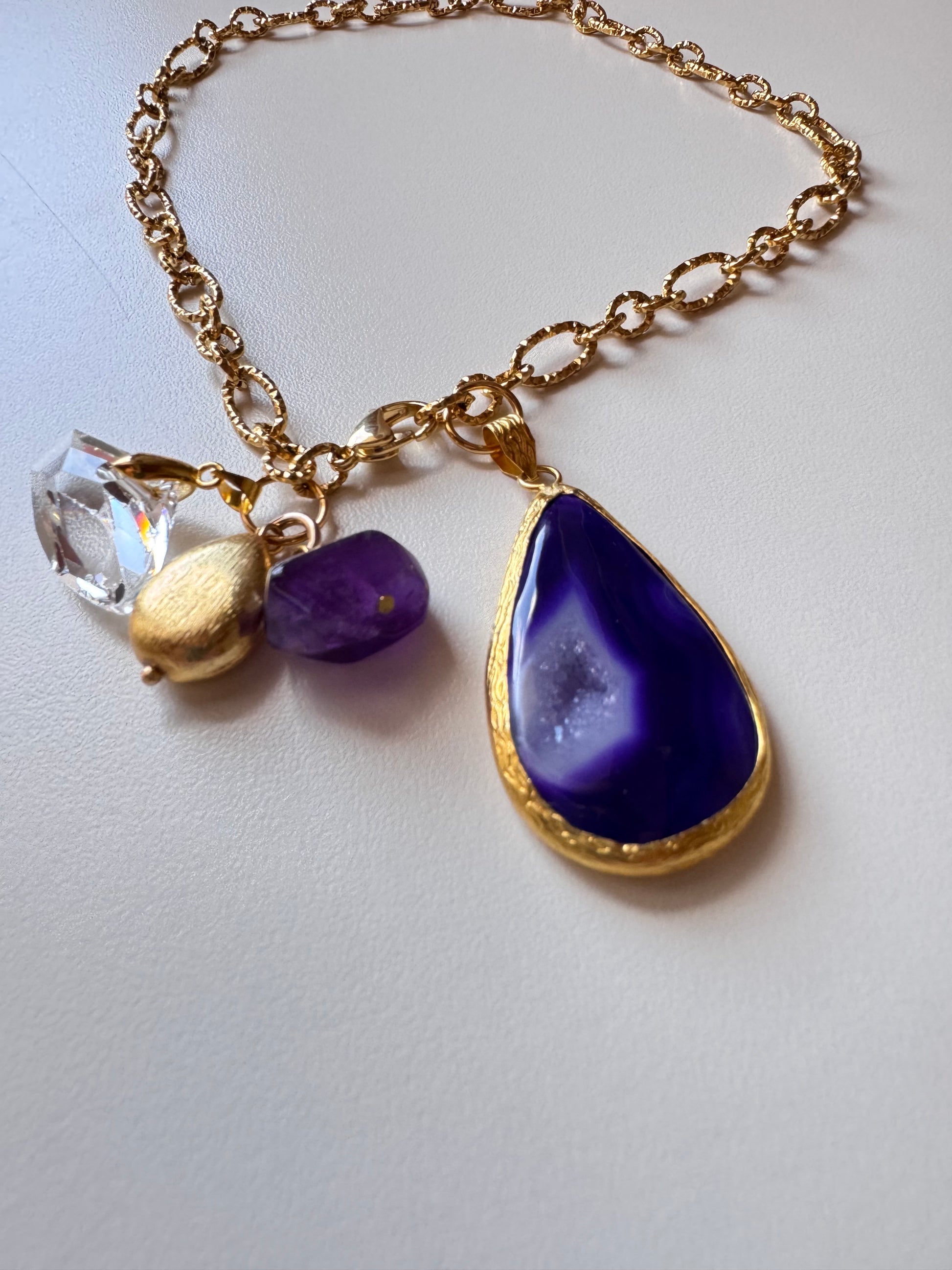 Un’agata colorata come punto focale, una catena in acciaio inossidabile (che non scolorisce!) e una composizione di charms che cambia a seconda della variante.