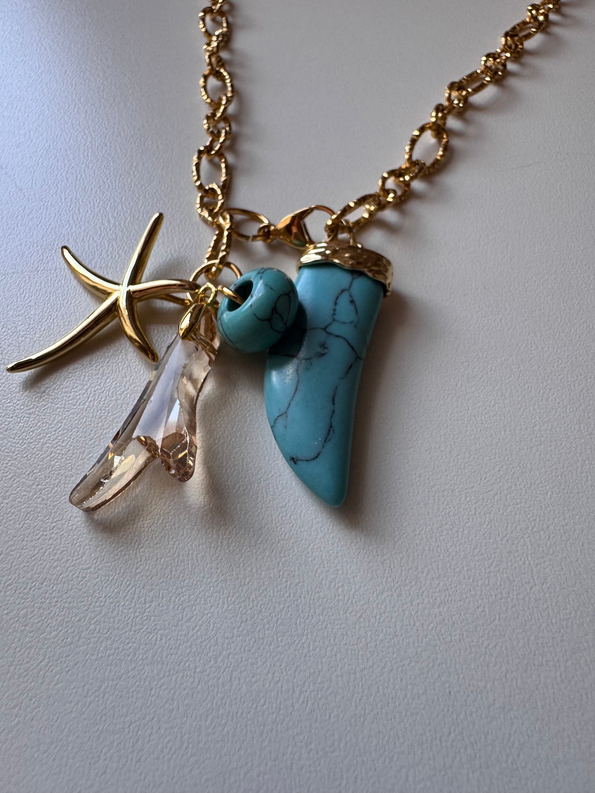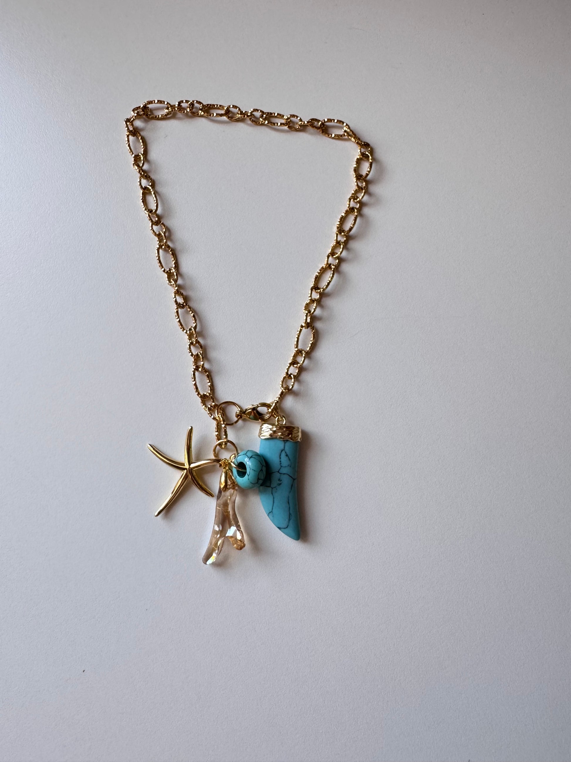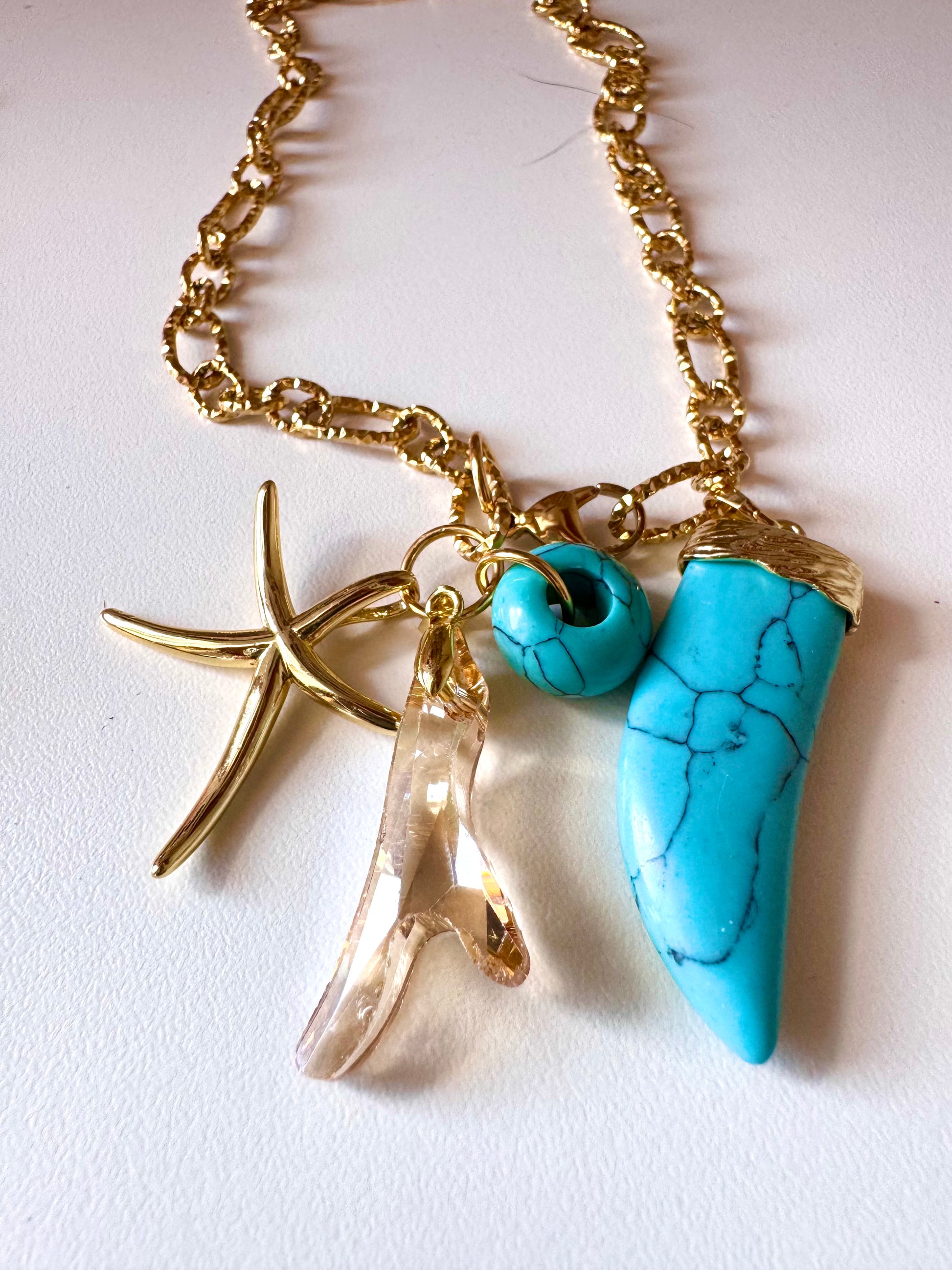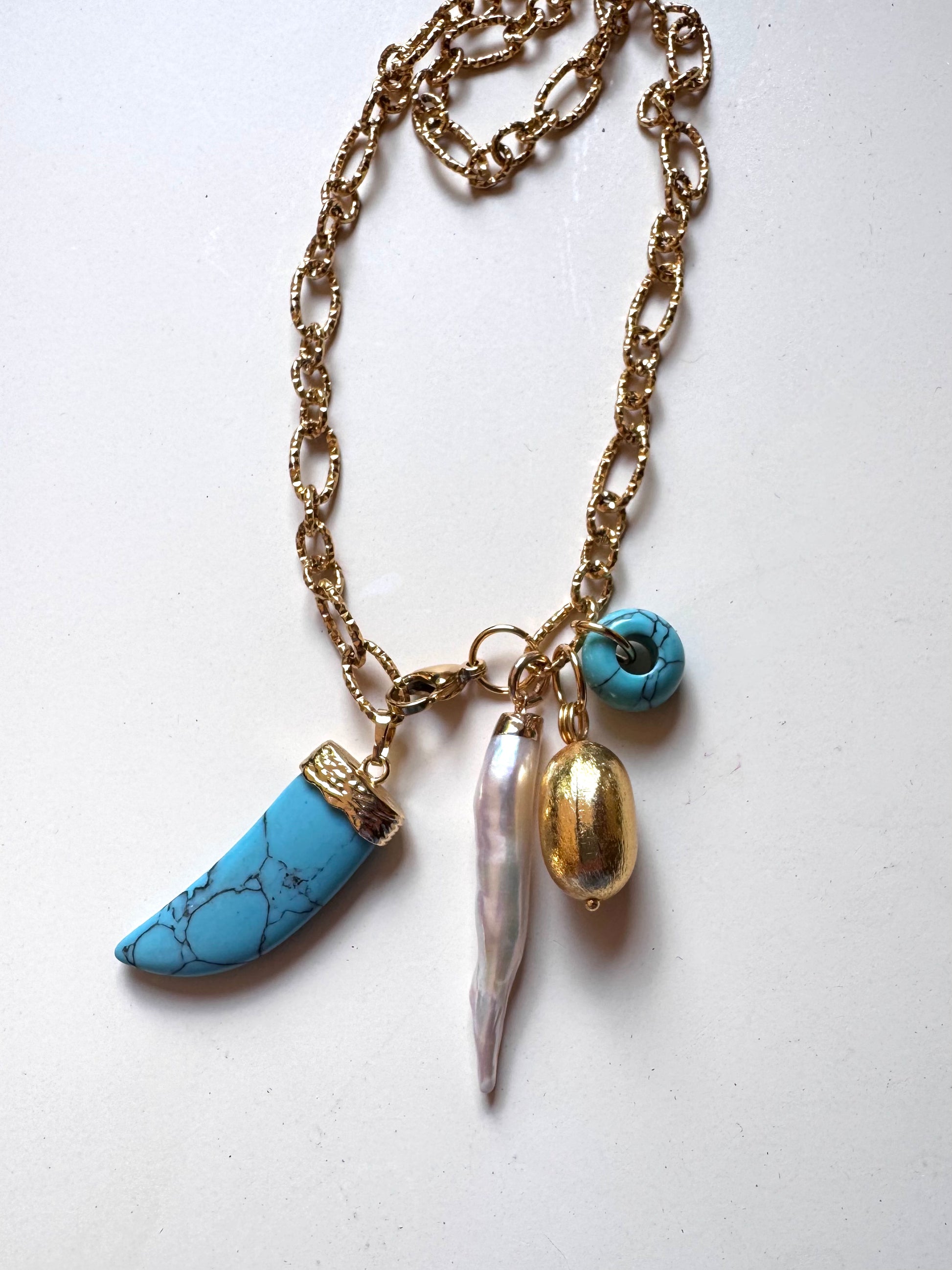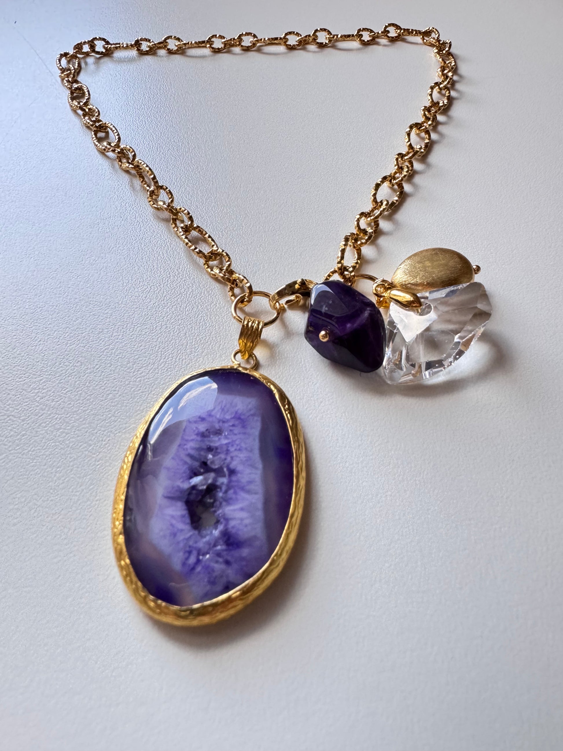 Un’agata colorata come punto focale, una catena in acciaio inossidabile (che non scolorisce!) e una composizione di charms che cambia a seconda della variante.