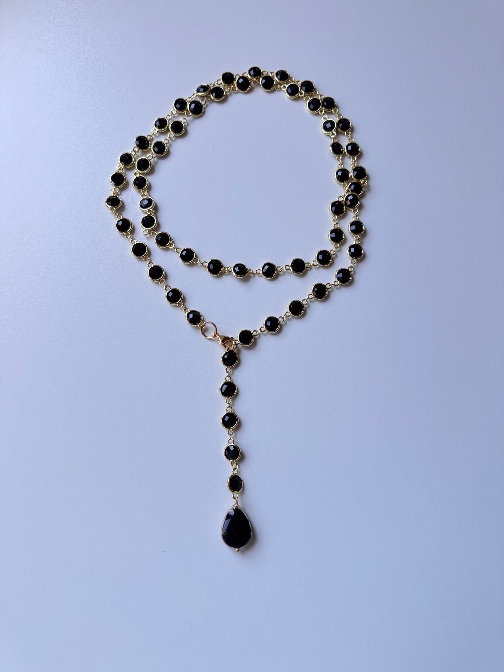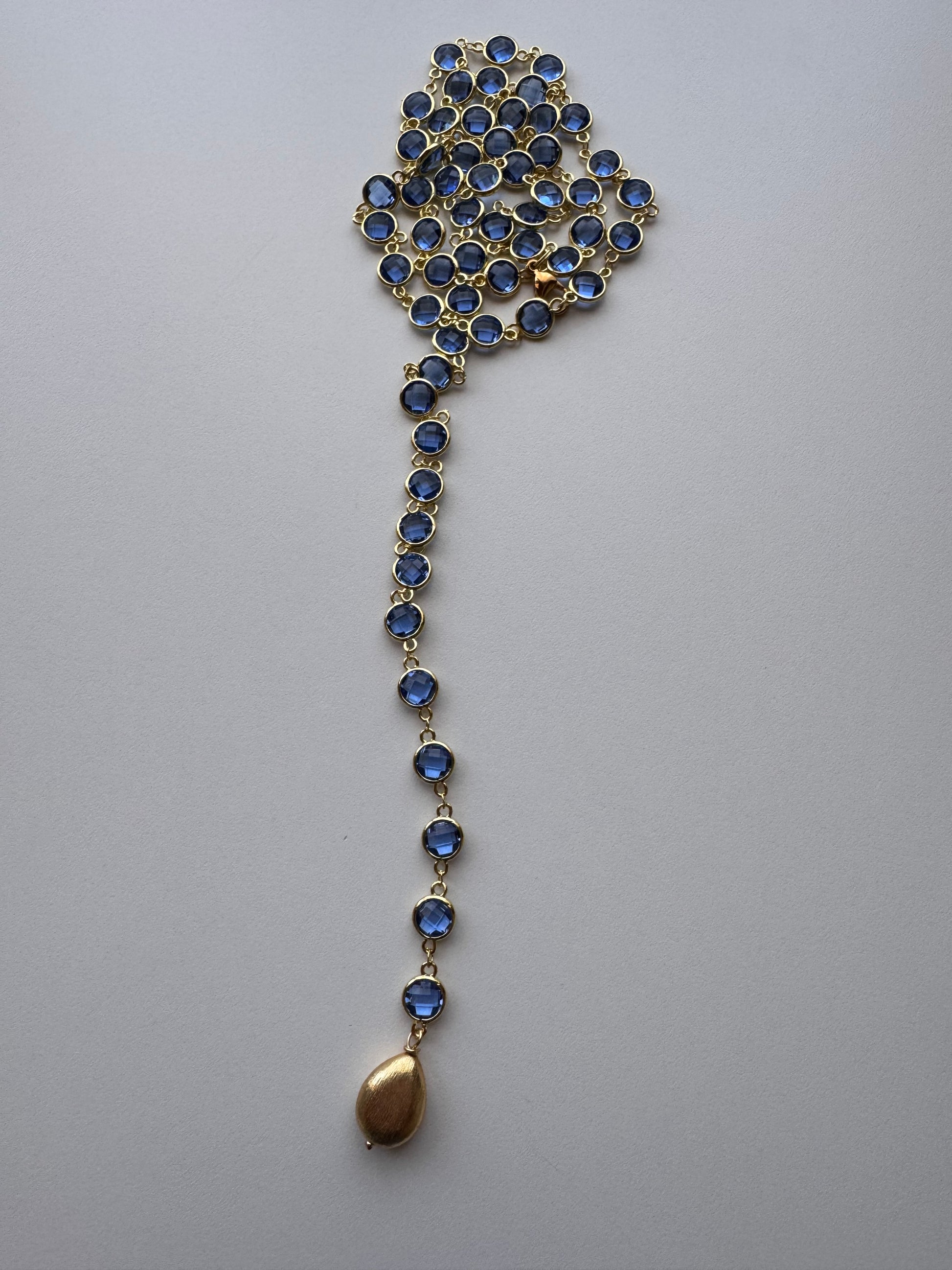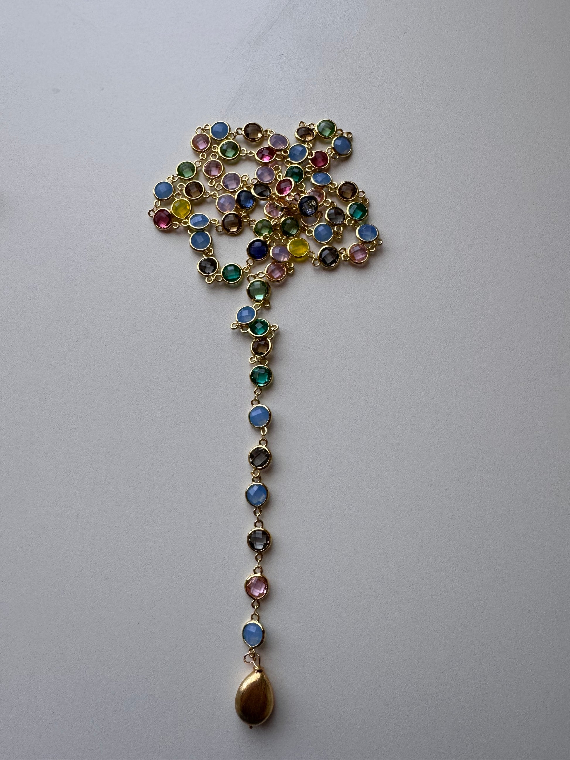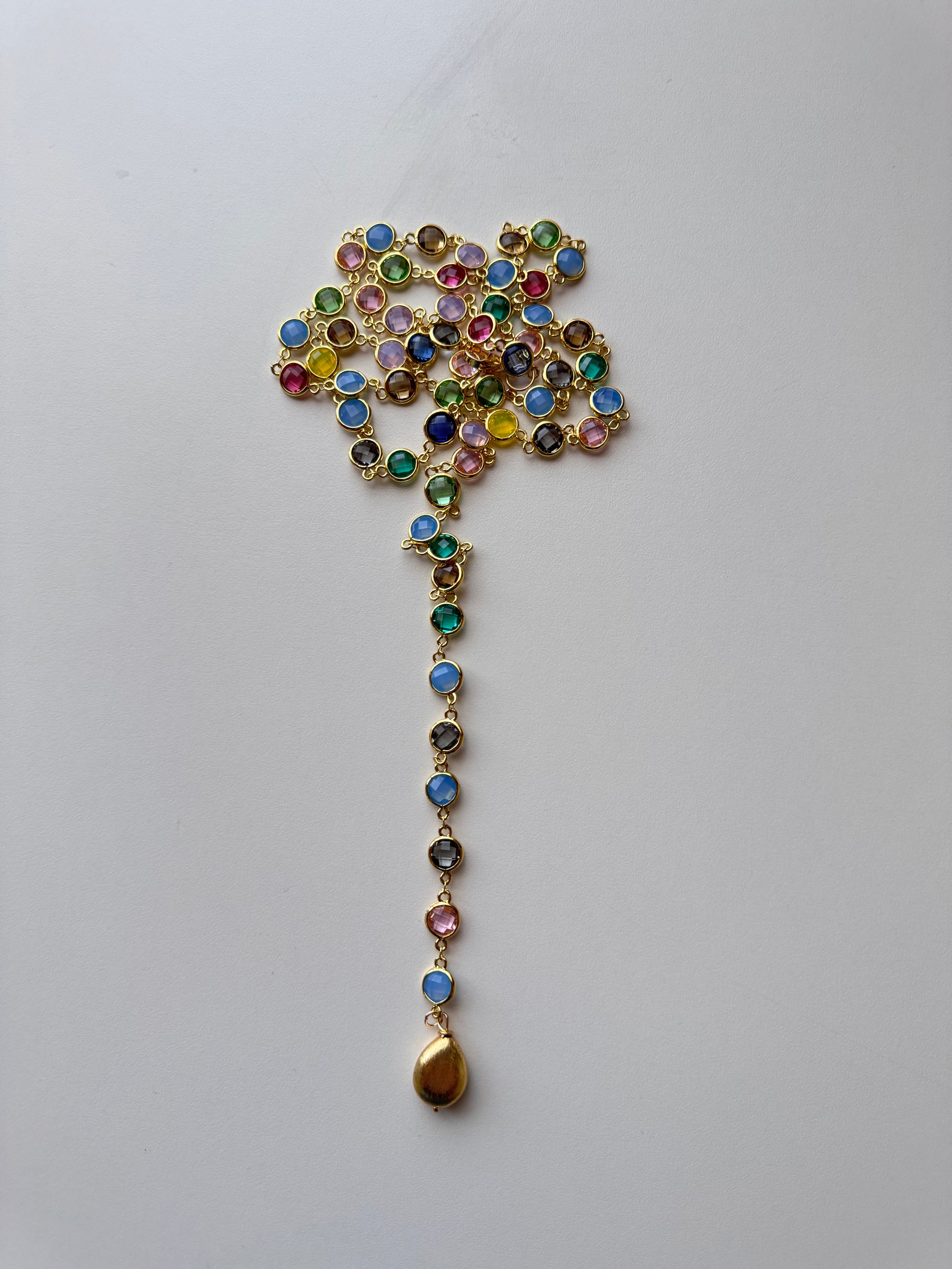 Una lunga catena in acciaio (97/100cm) impreziosita da cristalli di vetro sfaccettati che catturano la luce a ogni movimento.