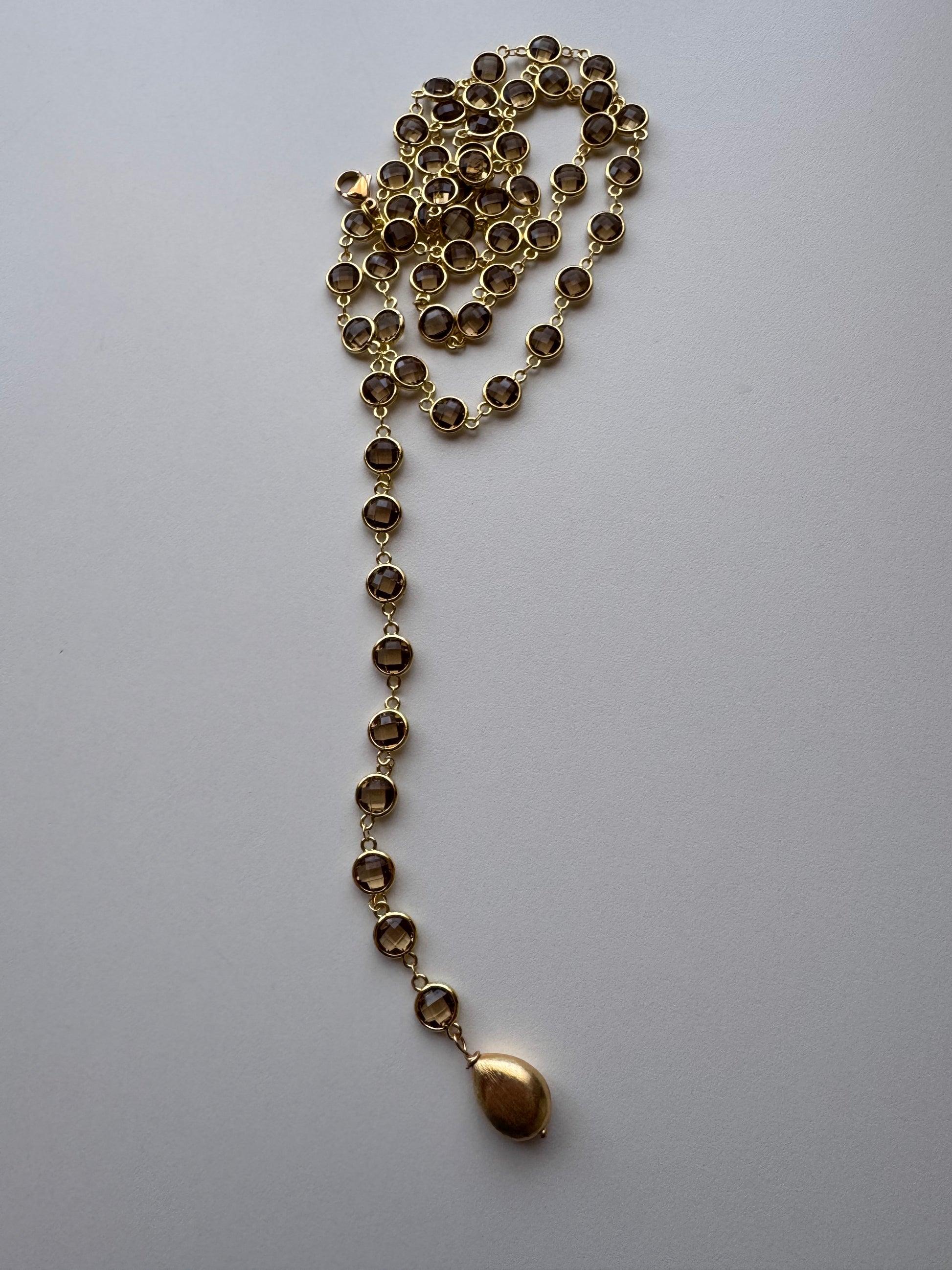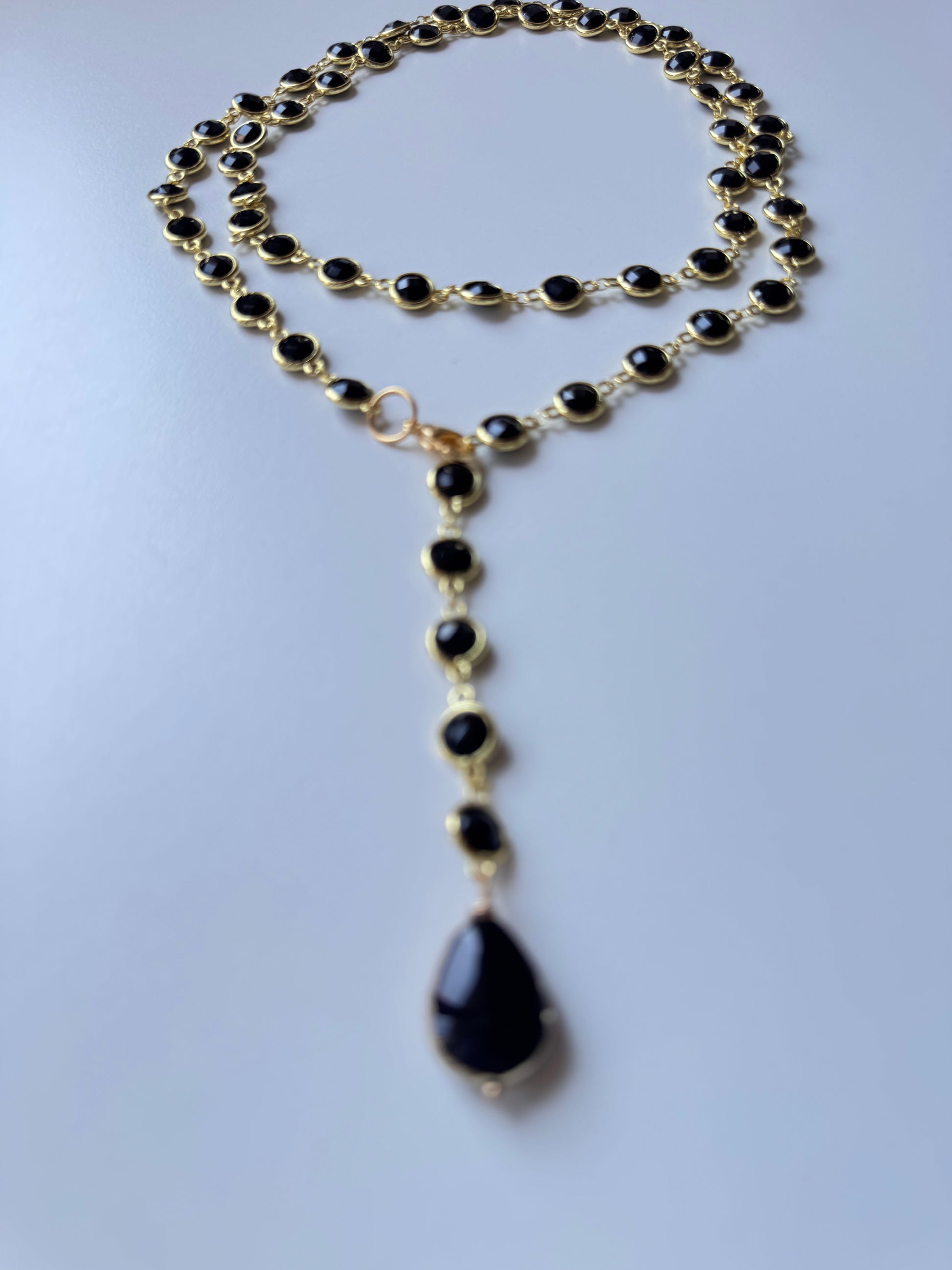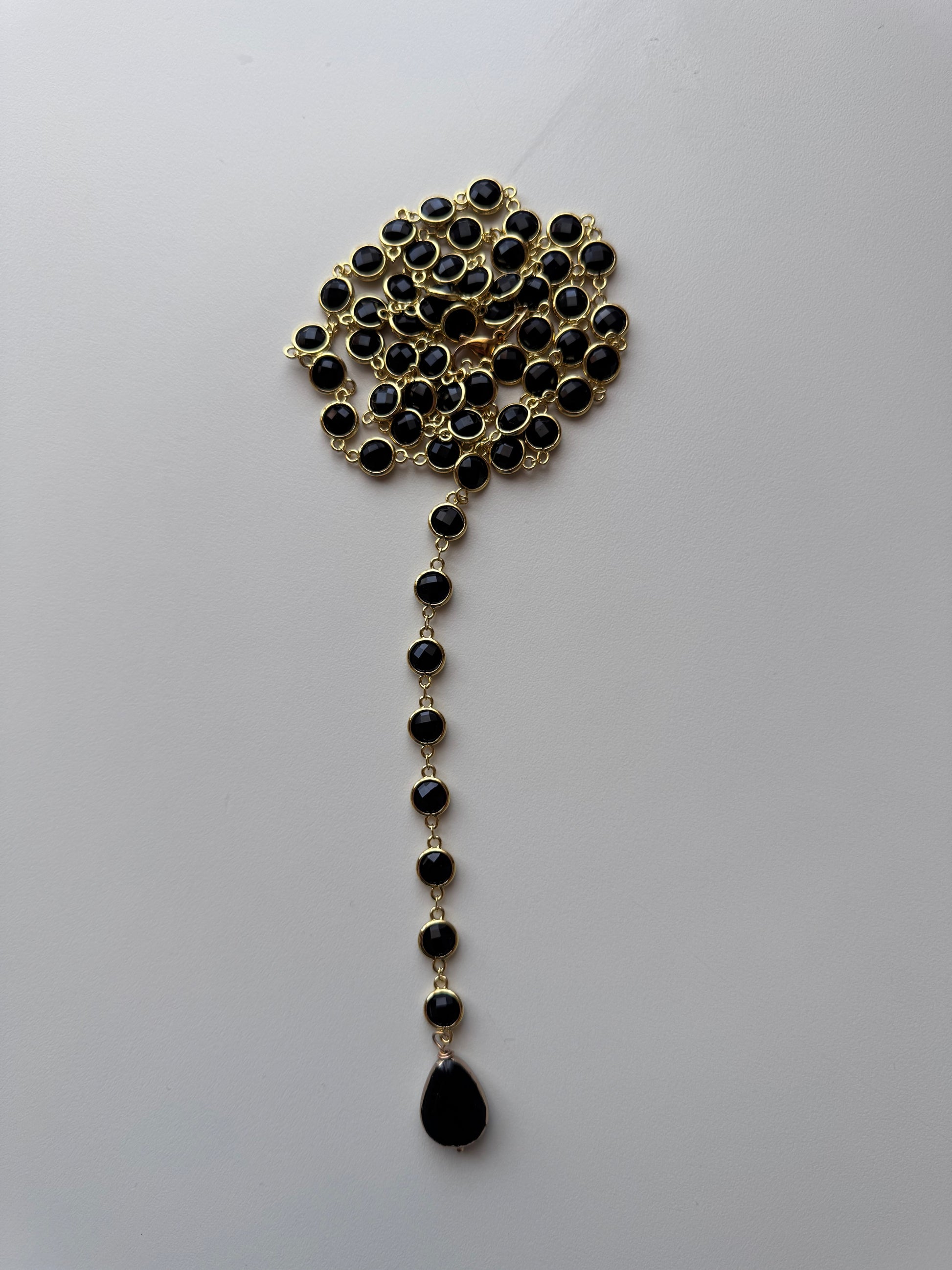 Una lunga catena in acciaio (97/100cm) impreziosita da cristalli di vetro sfaccettati che catturano la luce a ogni movimento.
