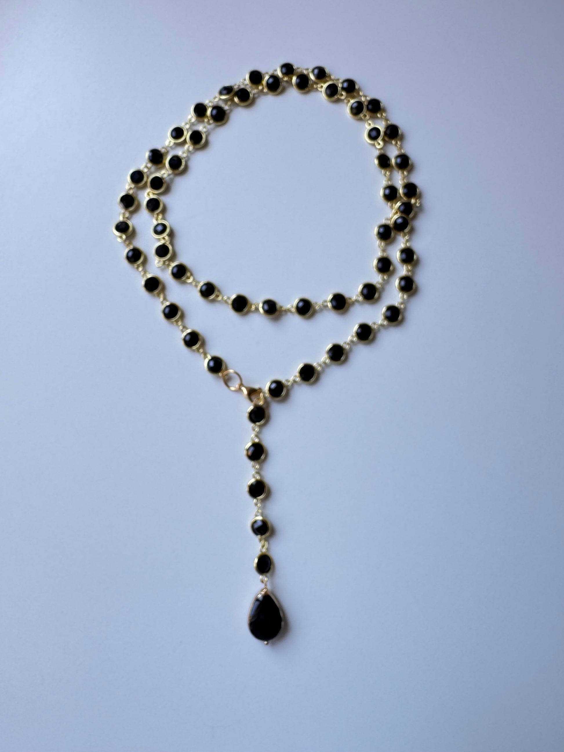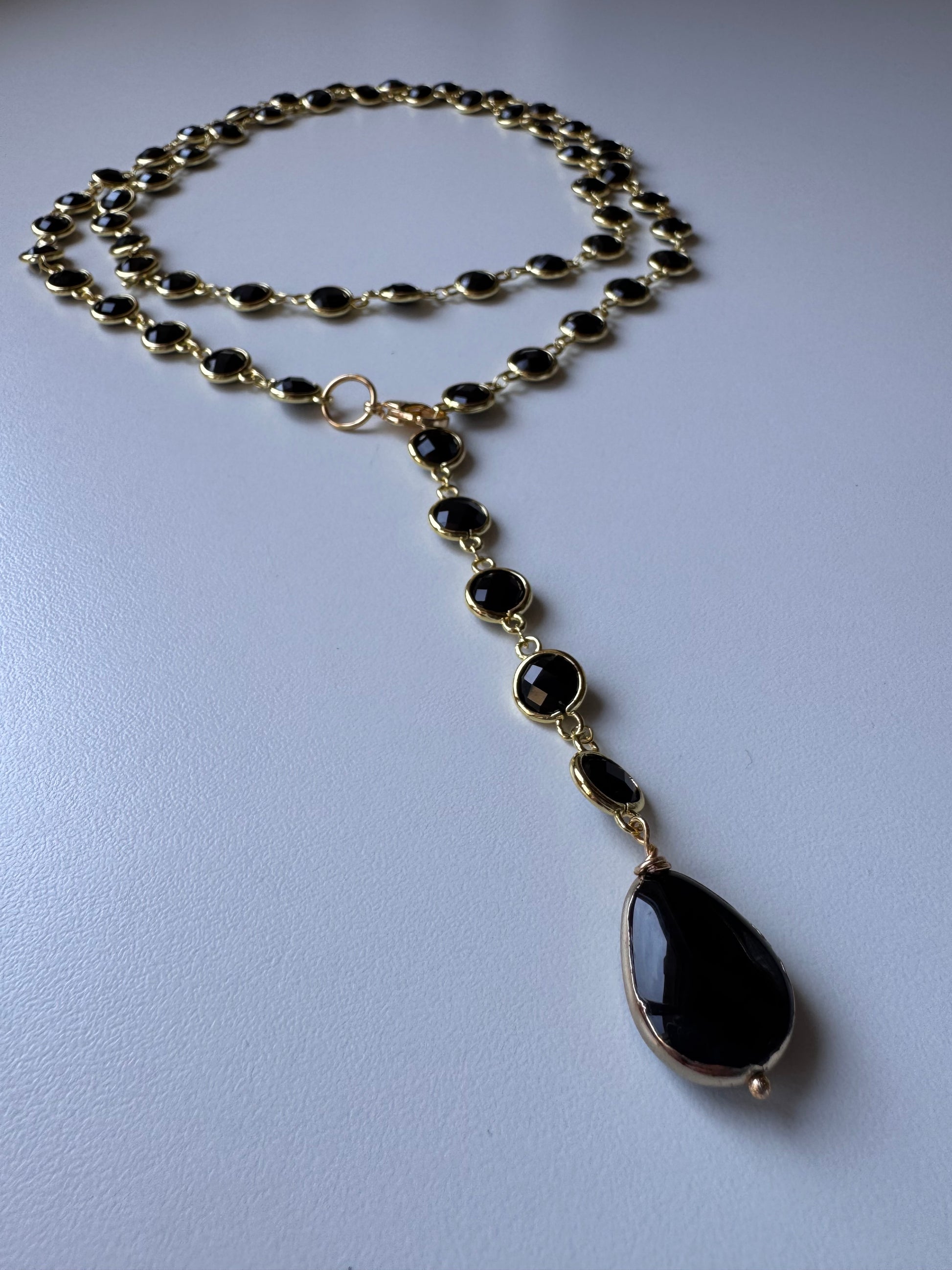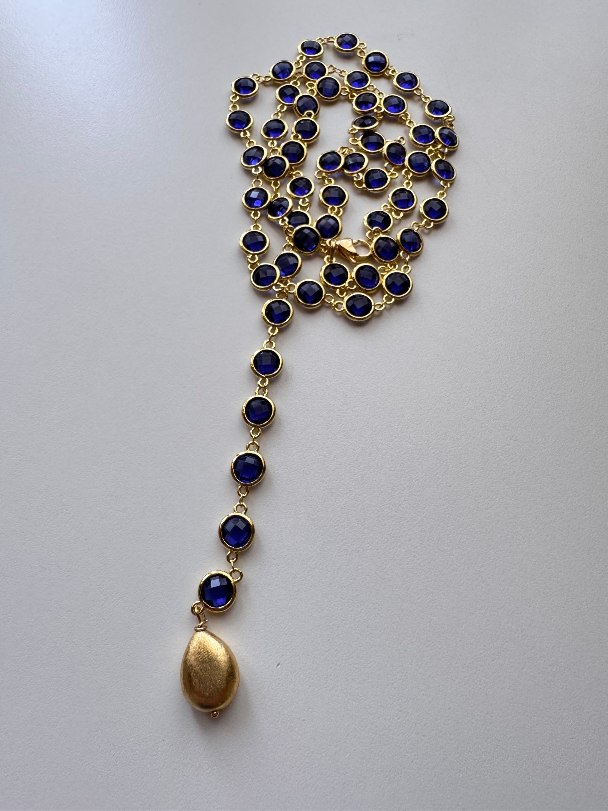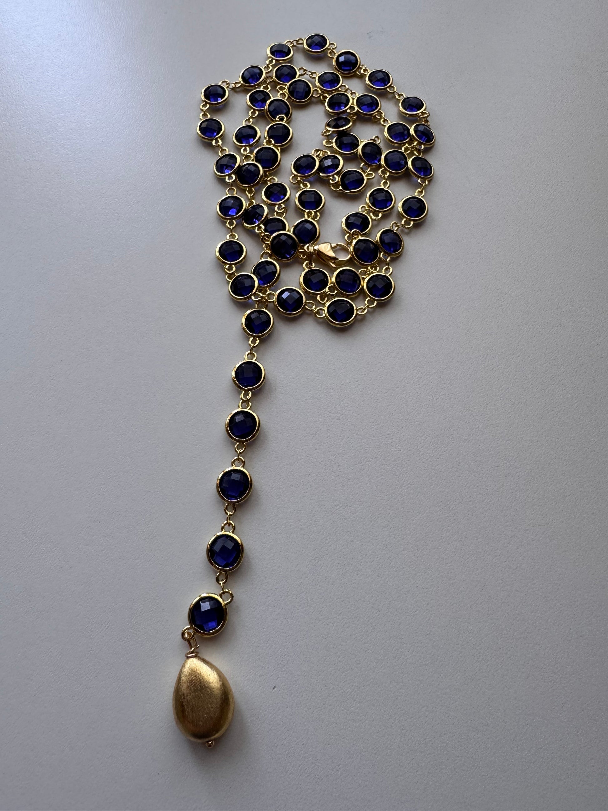 Una lunga catena in acciaio (97/100cm) impreziosita da cristalli di vetro sfaccettati che catturano la luce a ogni movimento.