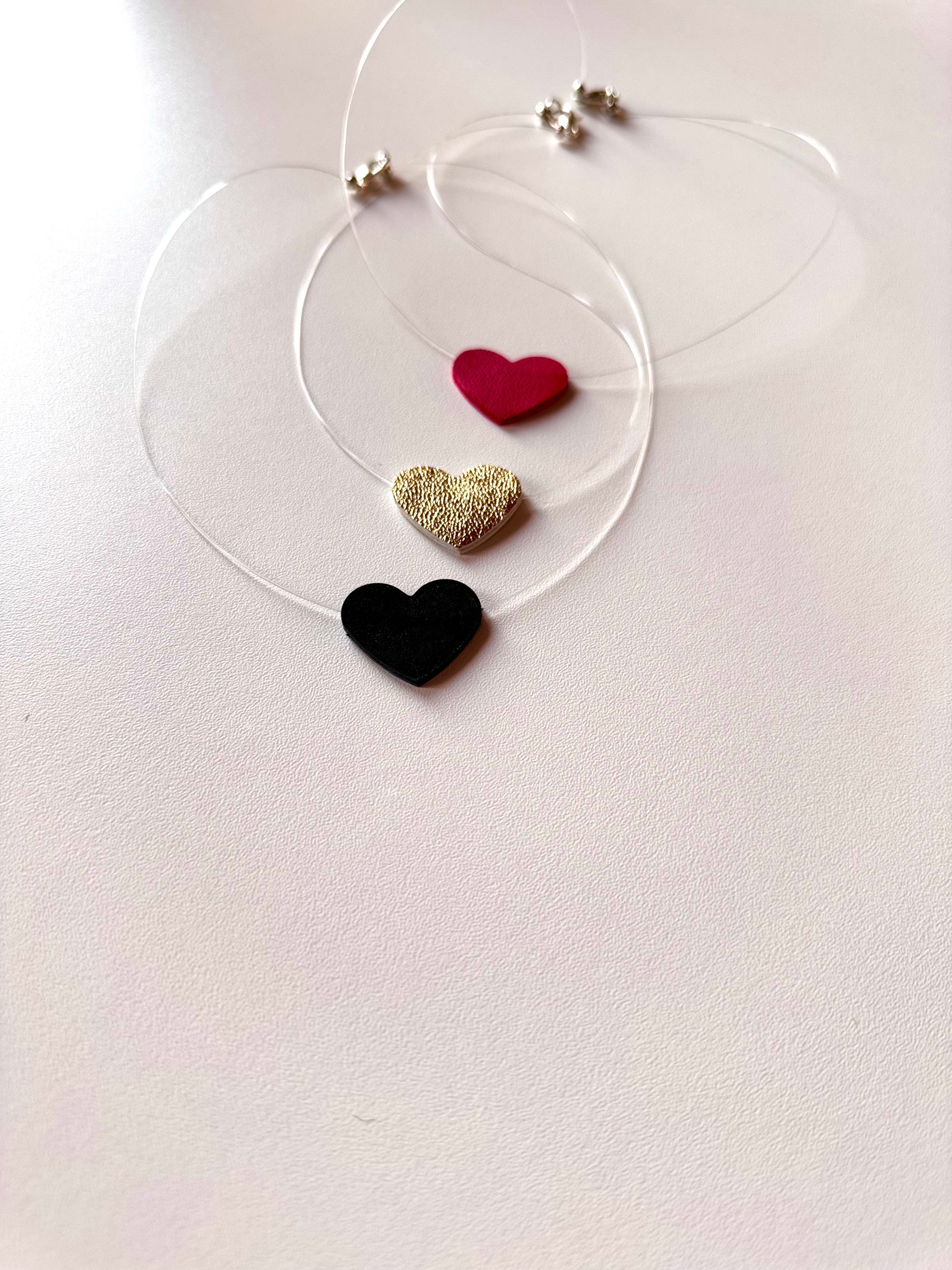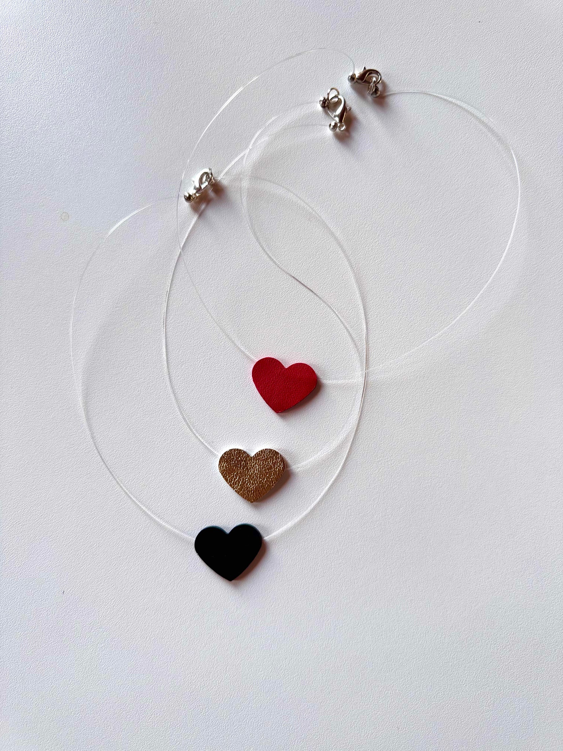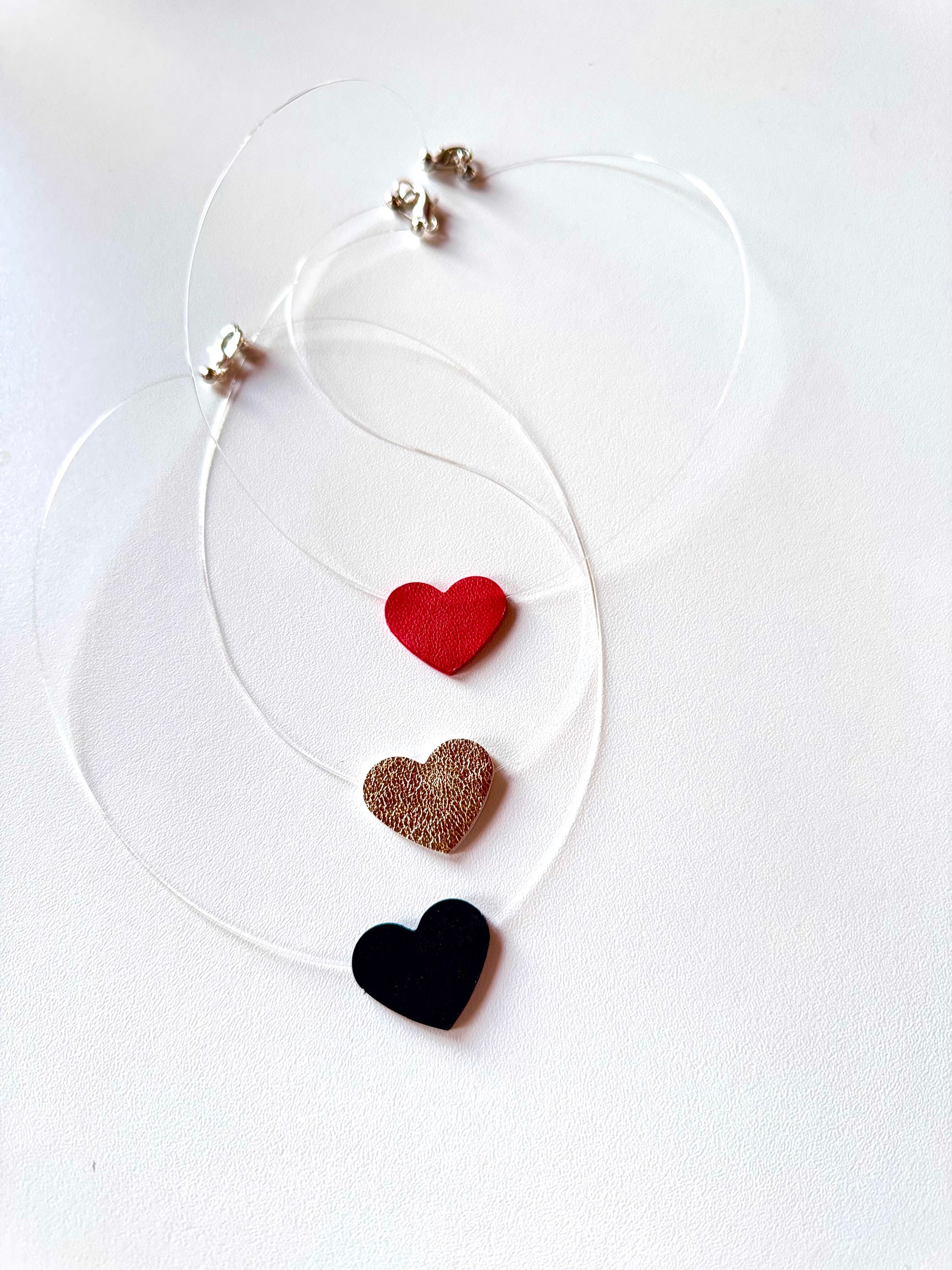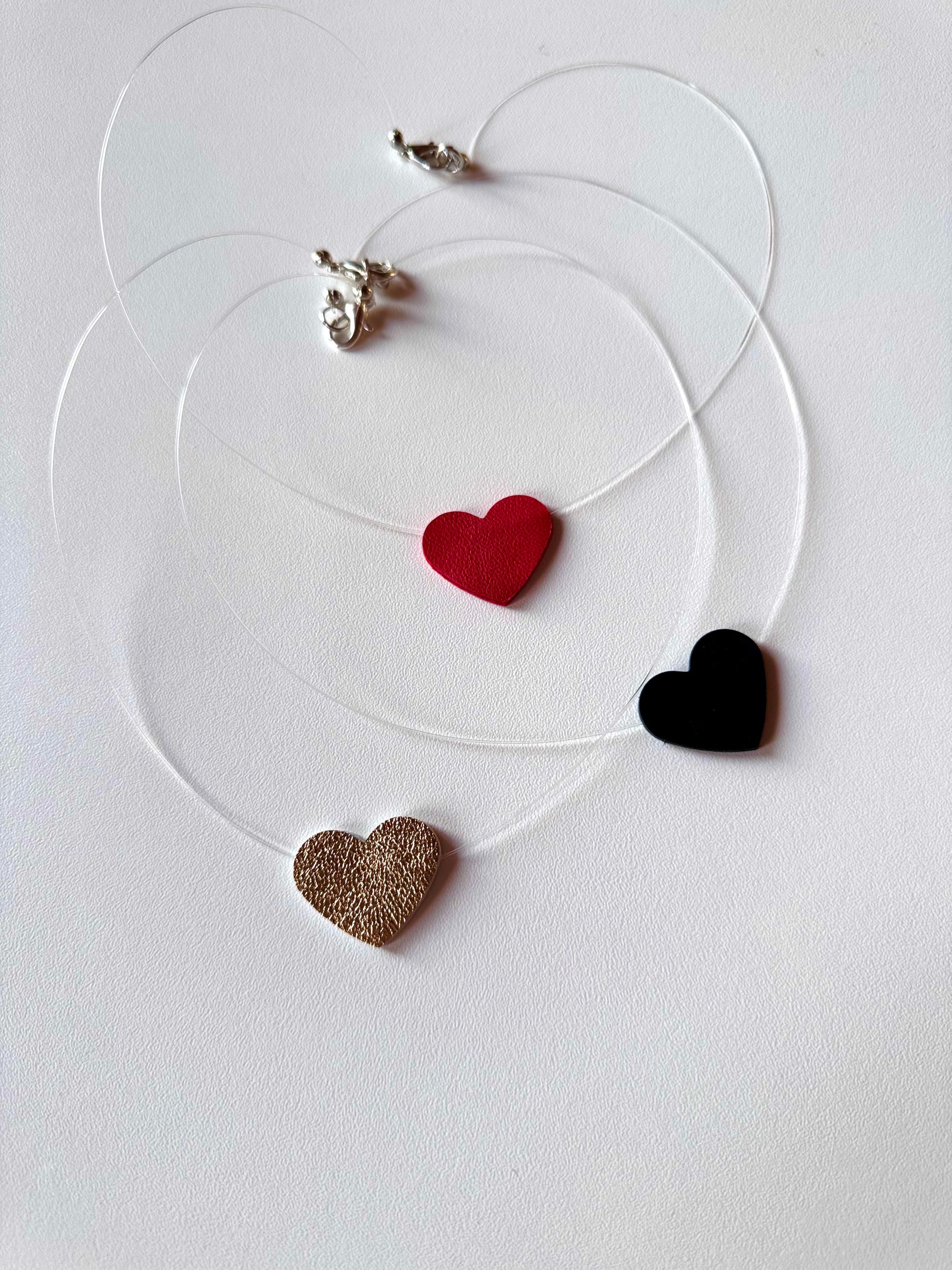 Ogni collana è realizzata con un filo di nylon trasparente, su cui fluttua un piccolo cuore in pelle. Il set comprende tre varianti di colore: rosso, nero e oro, da indossare singolarmente o insieme, a seconda dell’umore e dell’occasione.