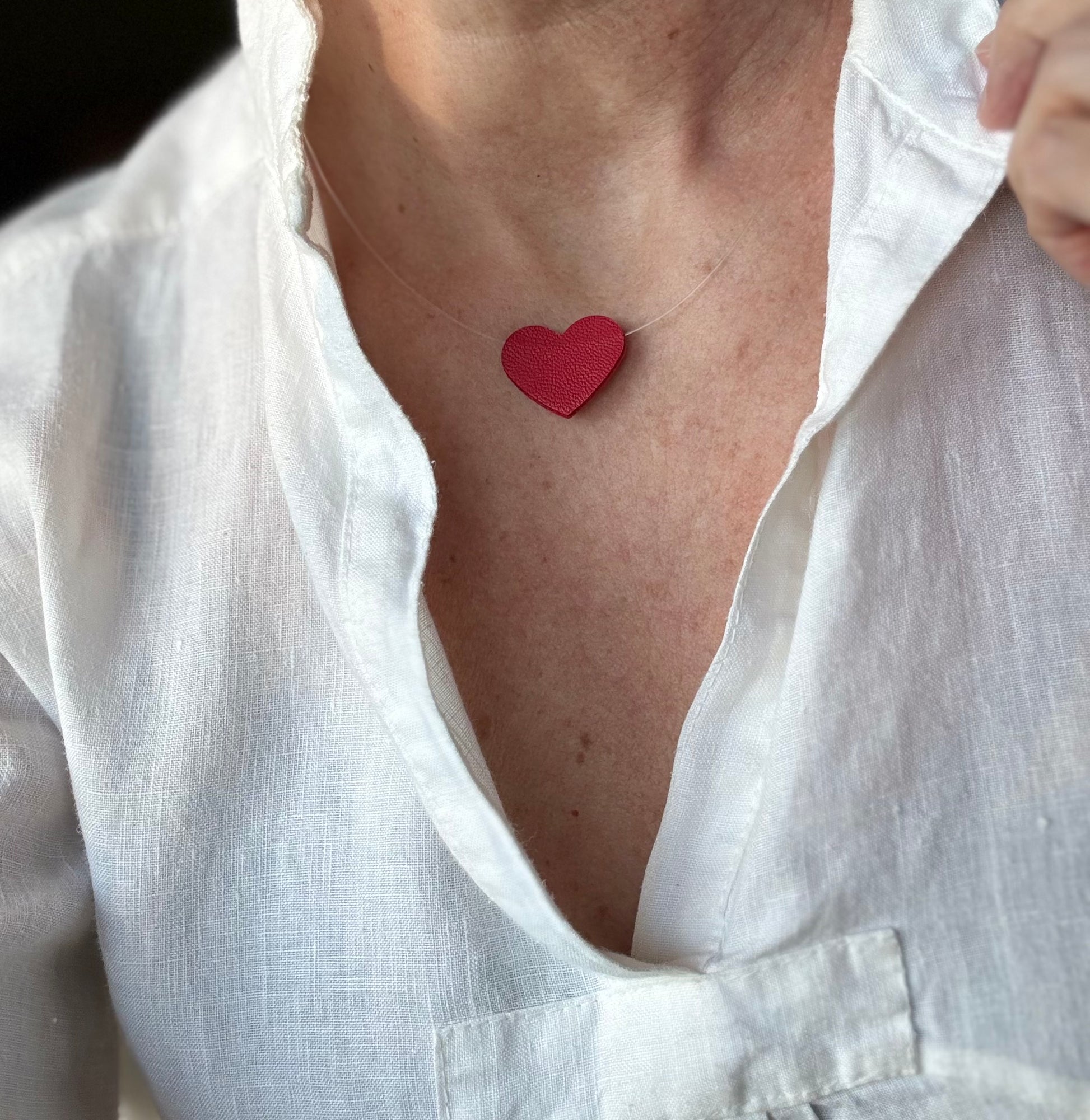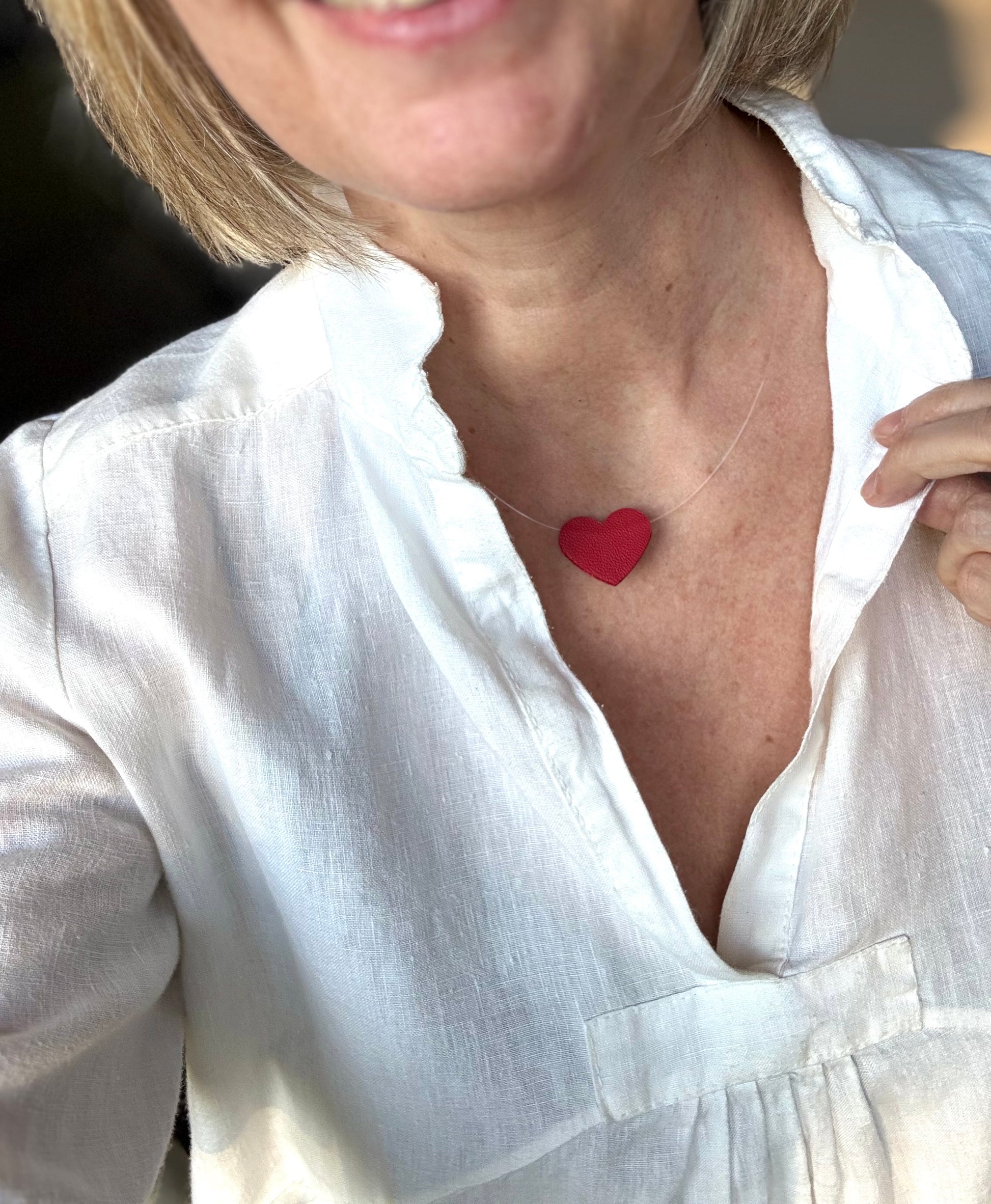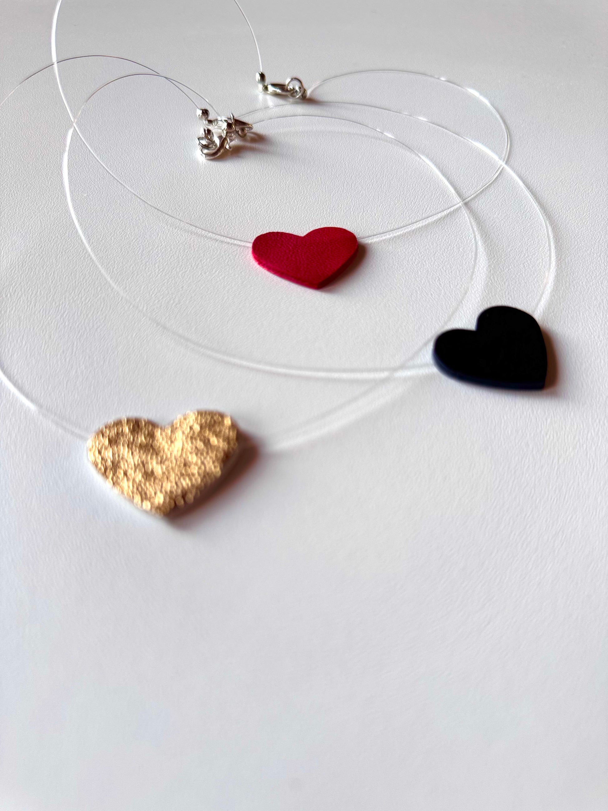 Ogni collana è realizzata con un filo di nylon trasparente, su cui fluttua un piccolo cuore in pelle. Il set comprende tre varianti di colore: rosso, nero e oro, da indossare singolarmente o insieme, a seconda dell’umore e dell’occasione.