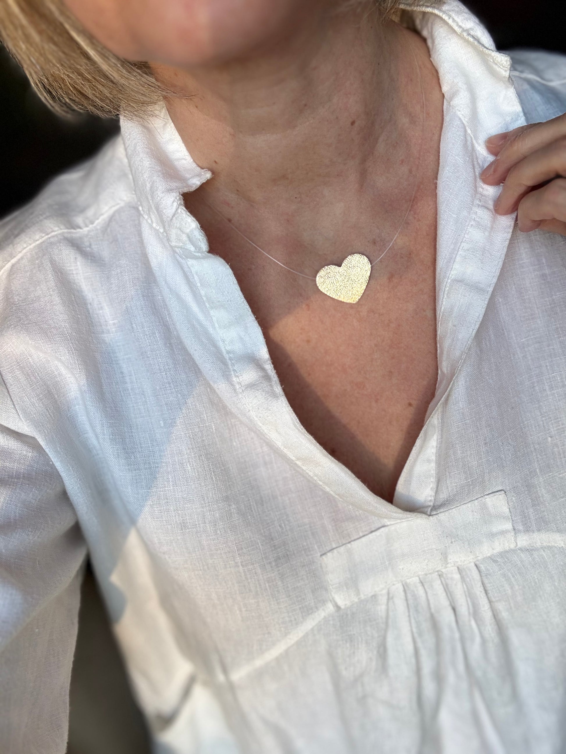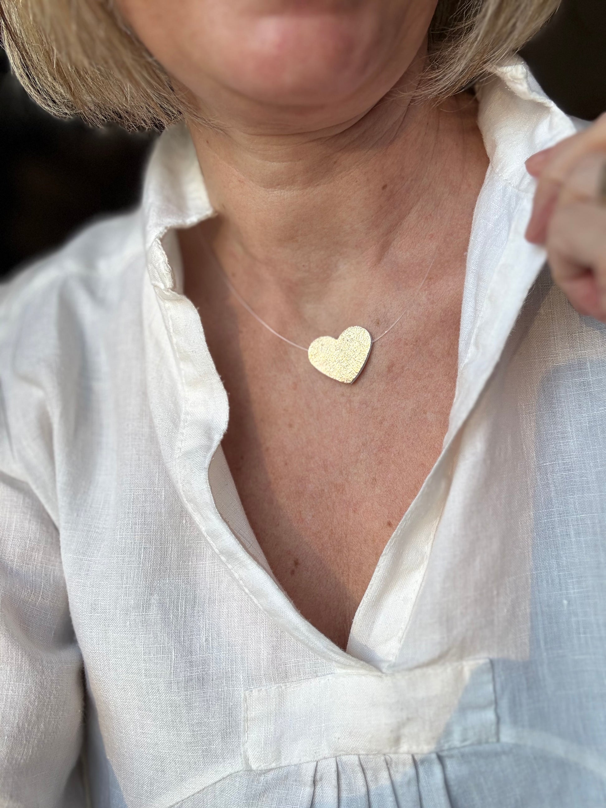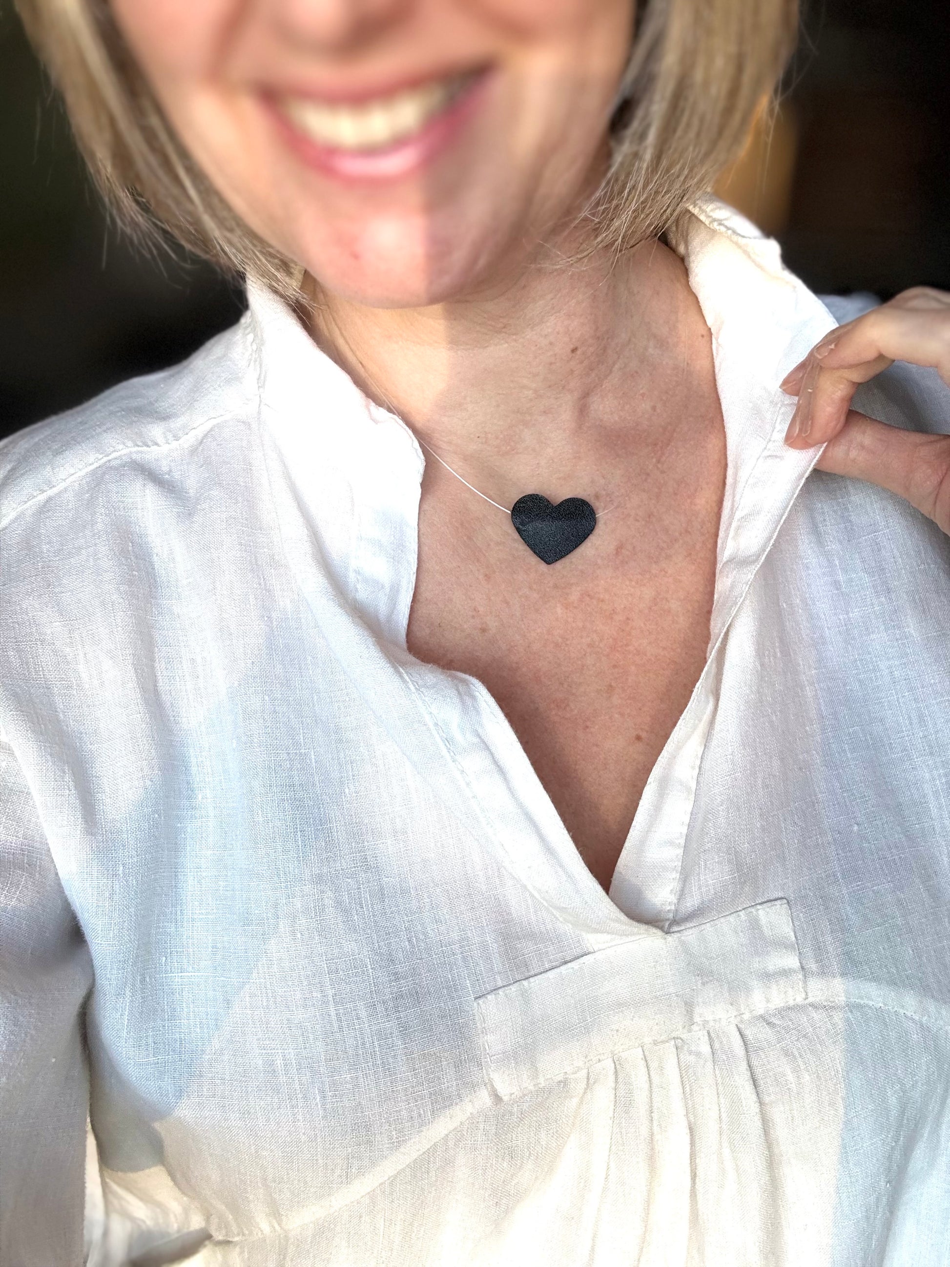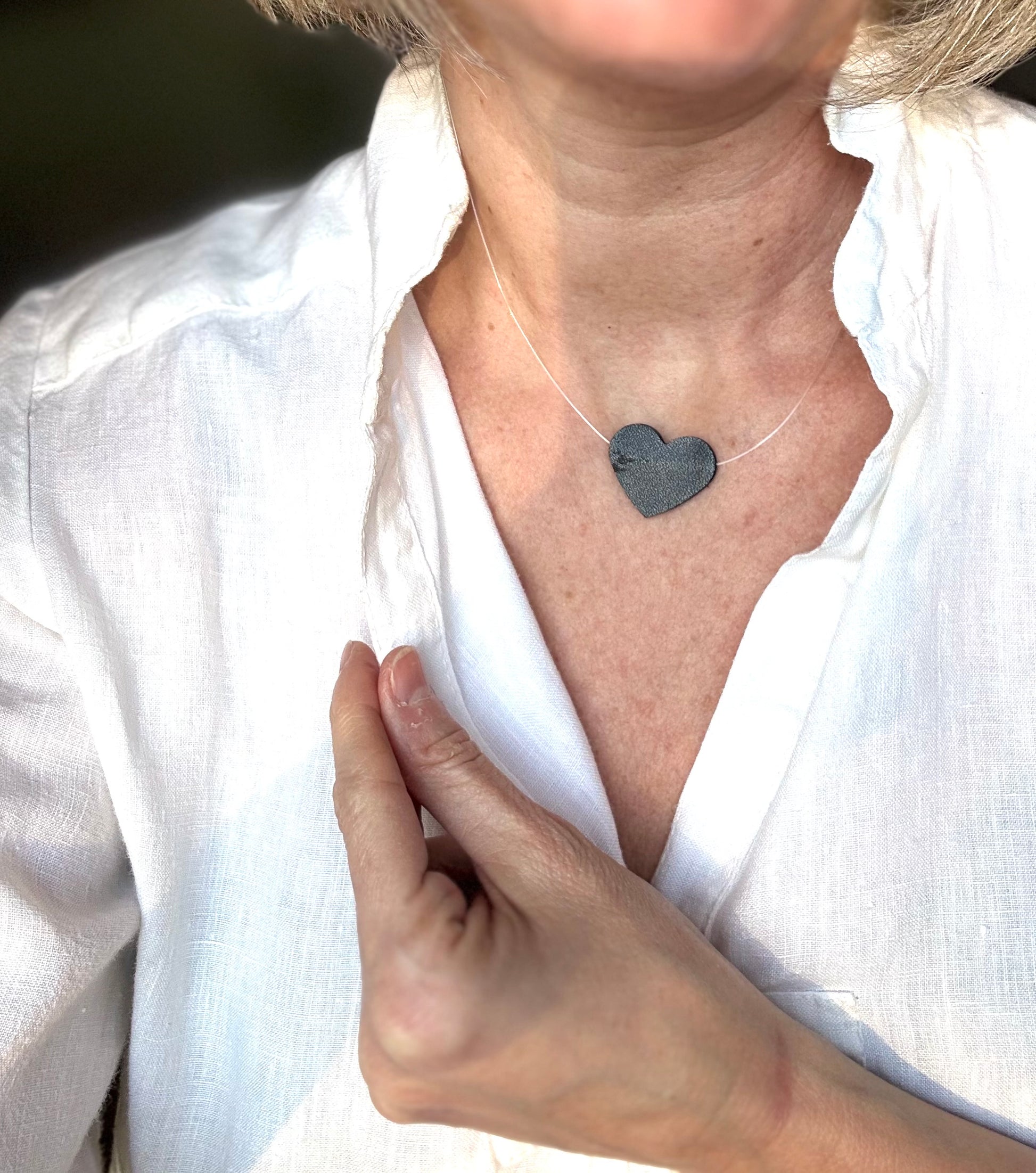 Ogni collana è realizzata con un filo di nylon trasparente, su cui fluttua un piccolo cuore in pelle. Il set comprende tre varianti di colore: rosso, nero e oro, da indossare singolarmente o insieme, a seconda dell’umore e dell’occasione.