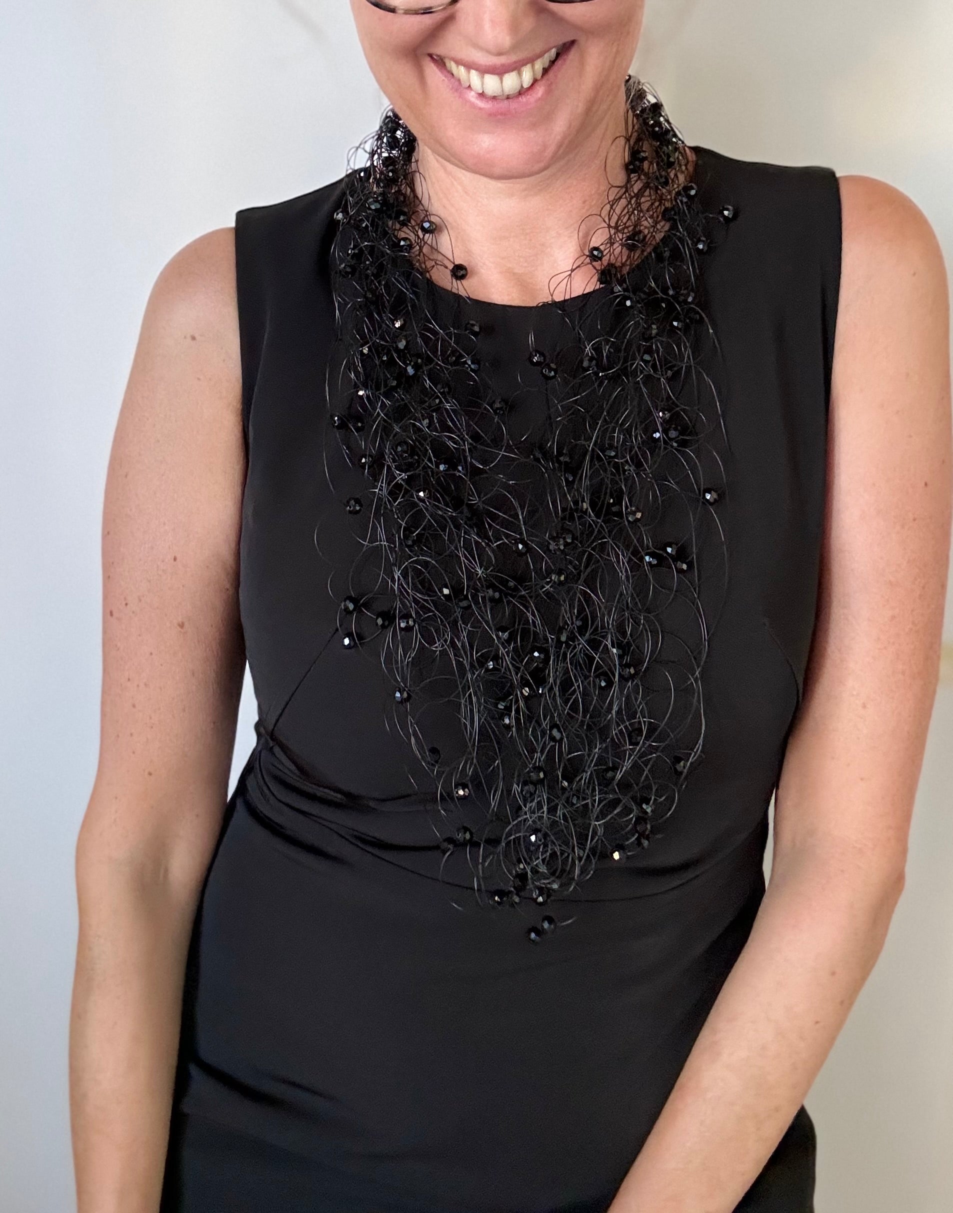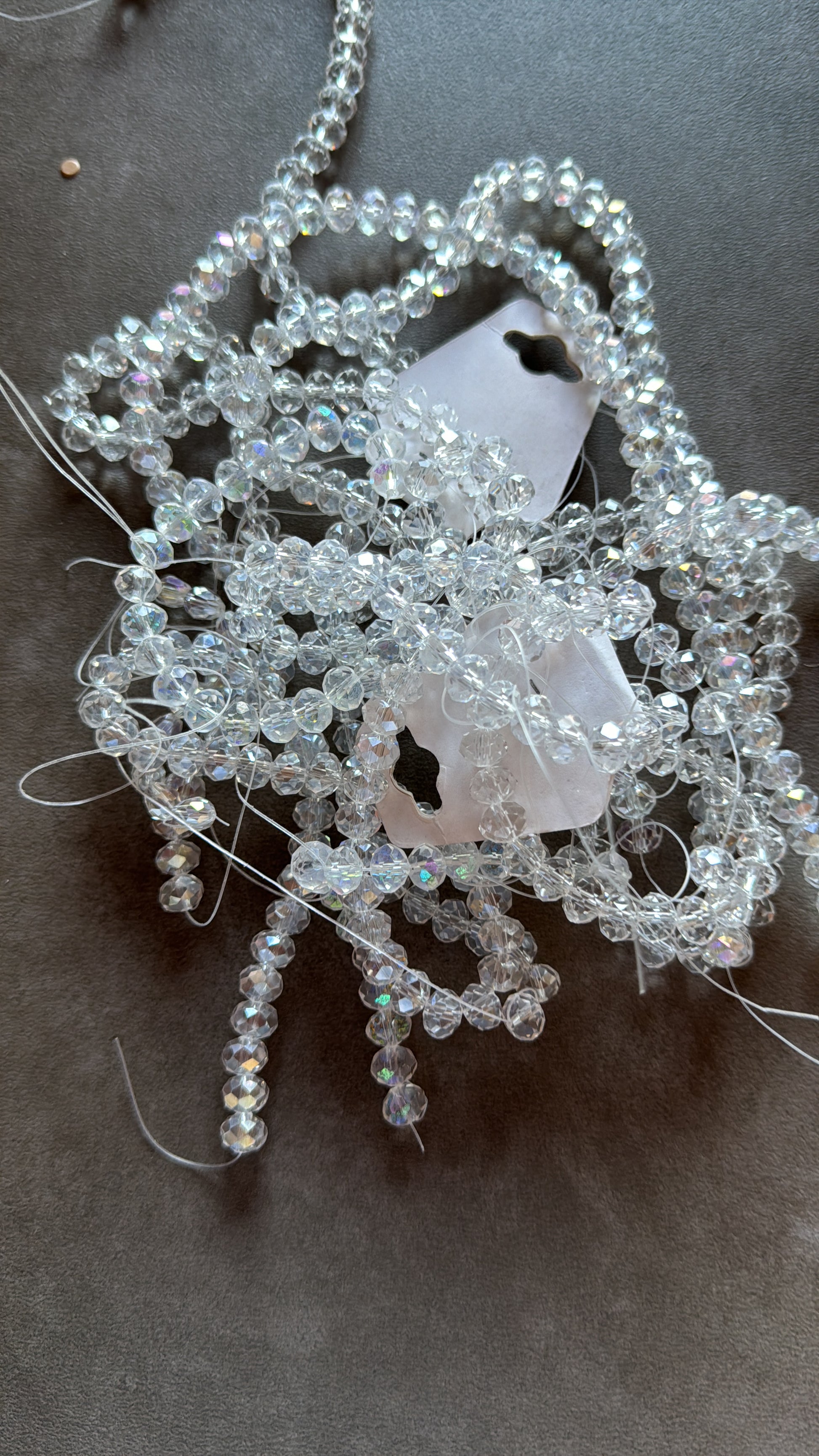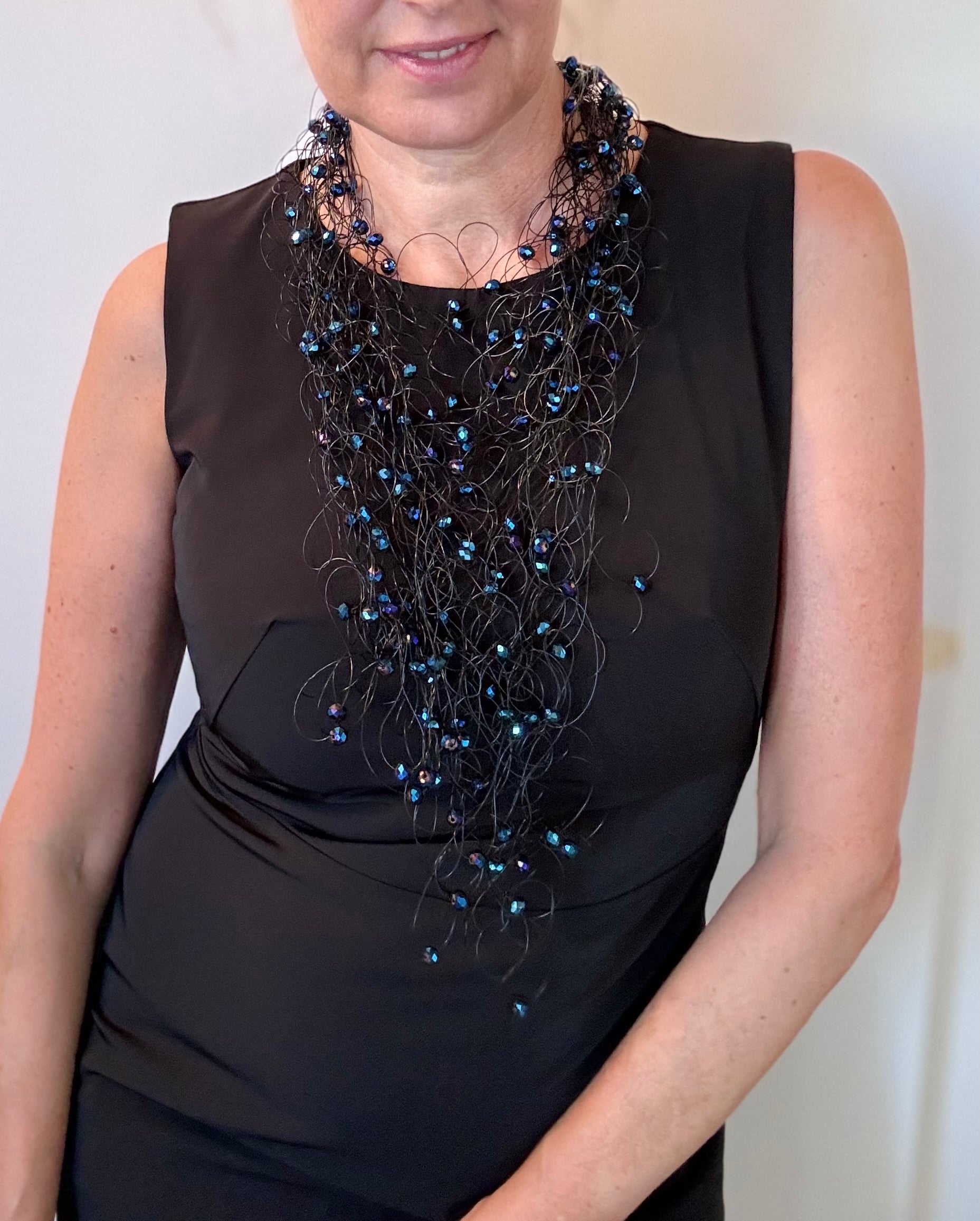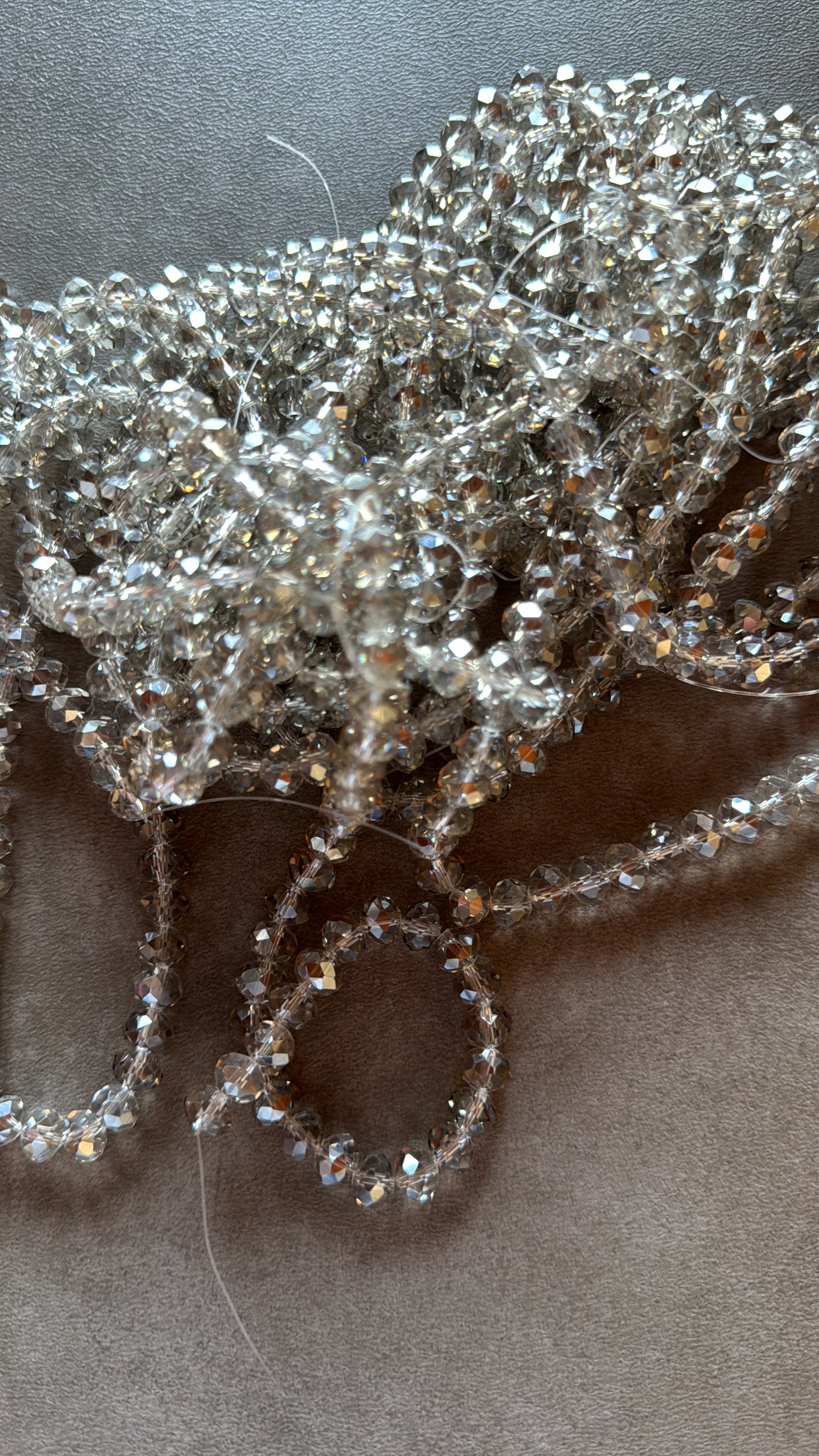 Immaginatevi una collana lunga e leggerissima, composta da fili di nylon e cristalli come gocce di rugiada catturano la luce e la riflettono in una danza incantevole.