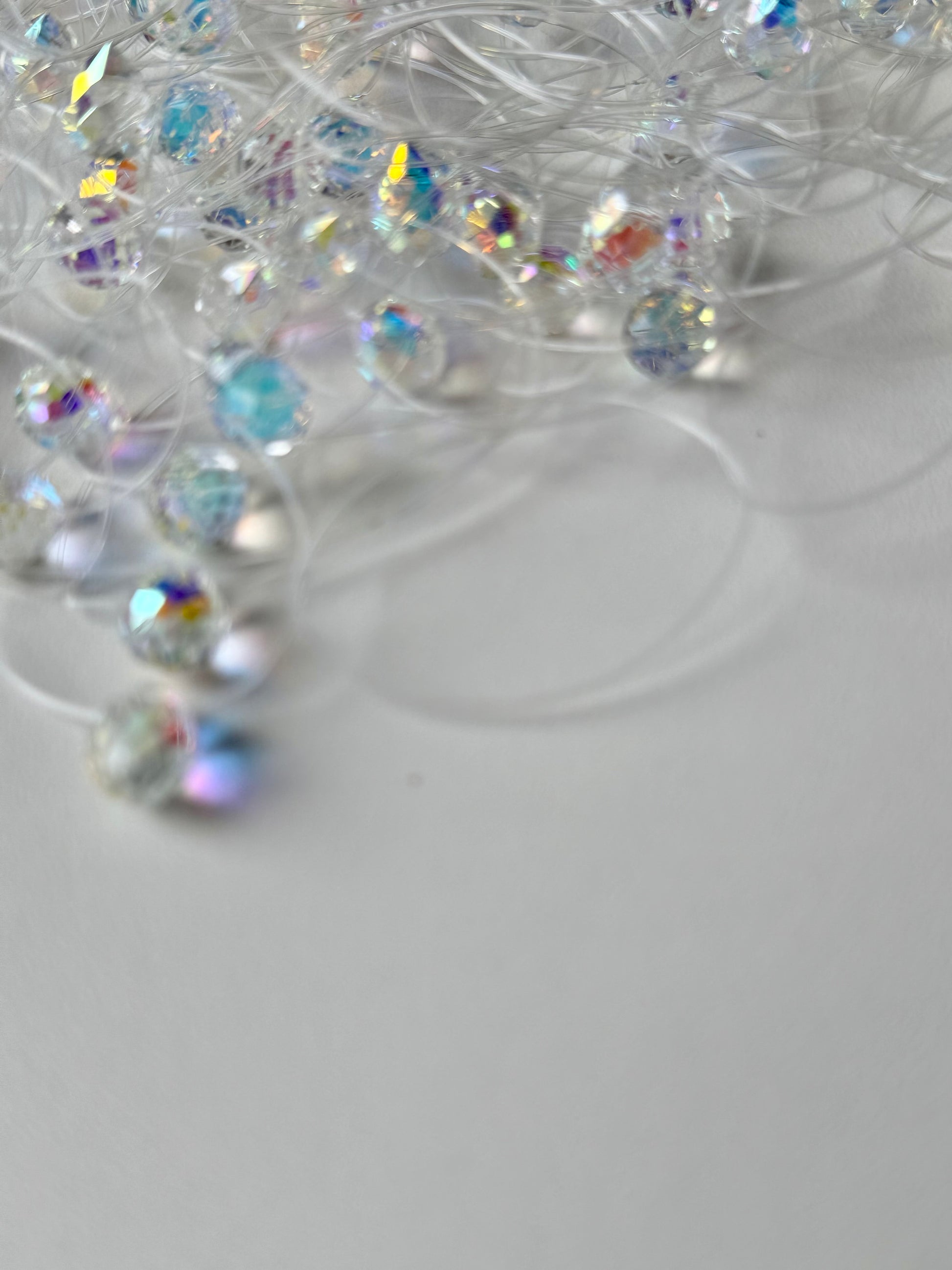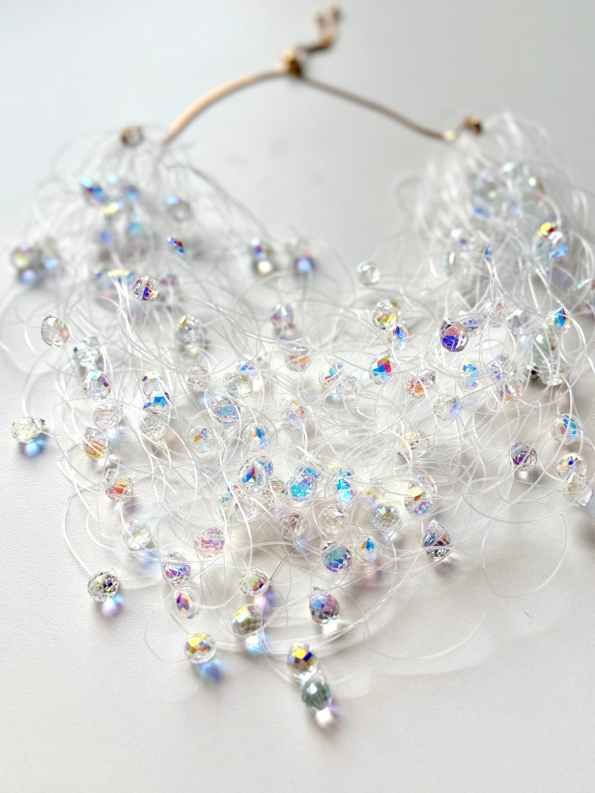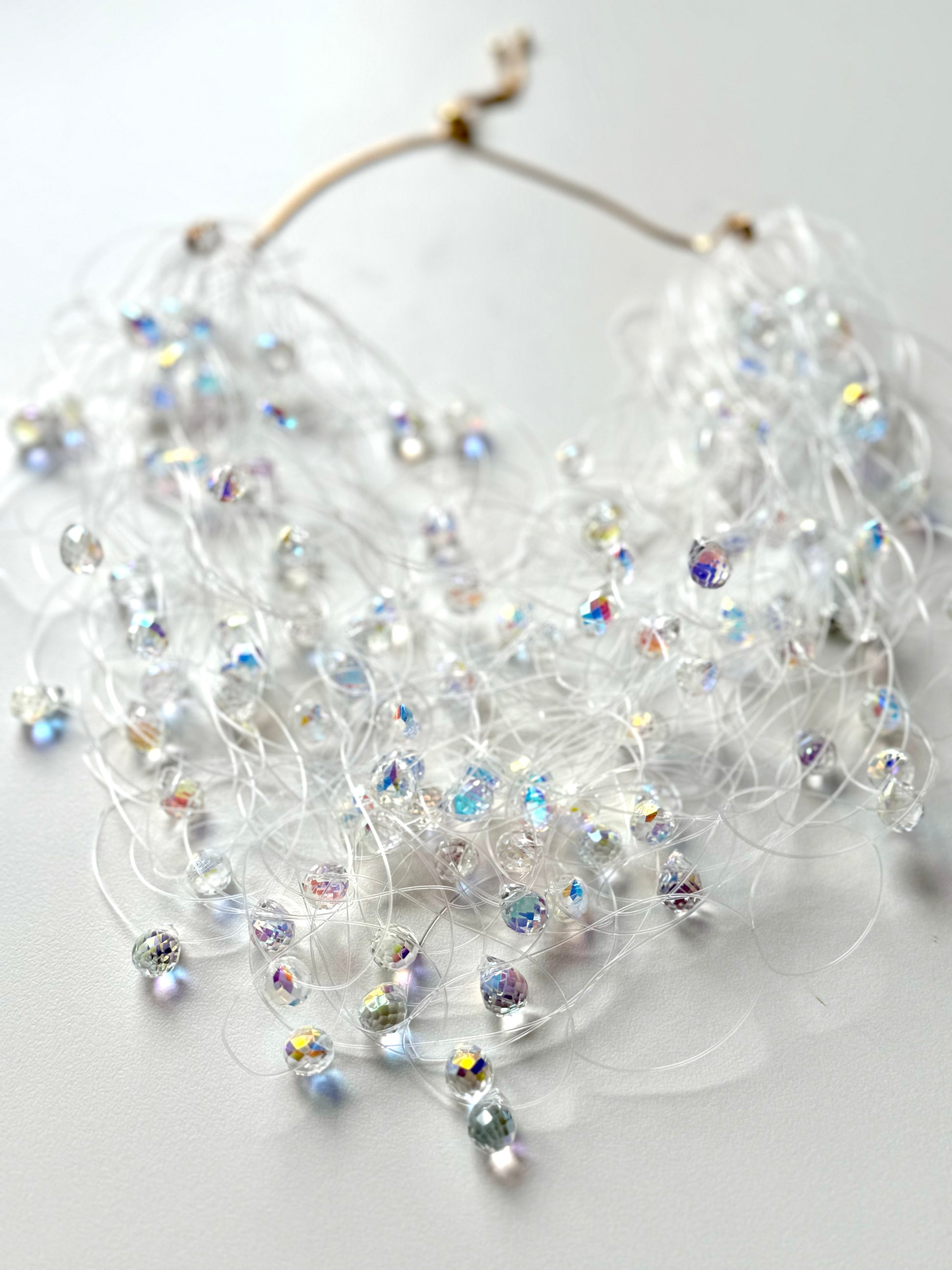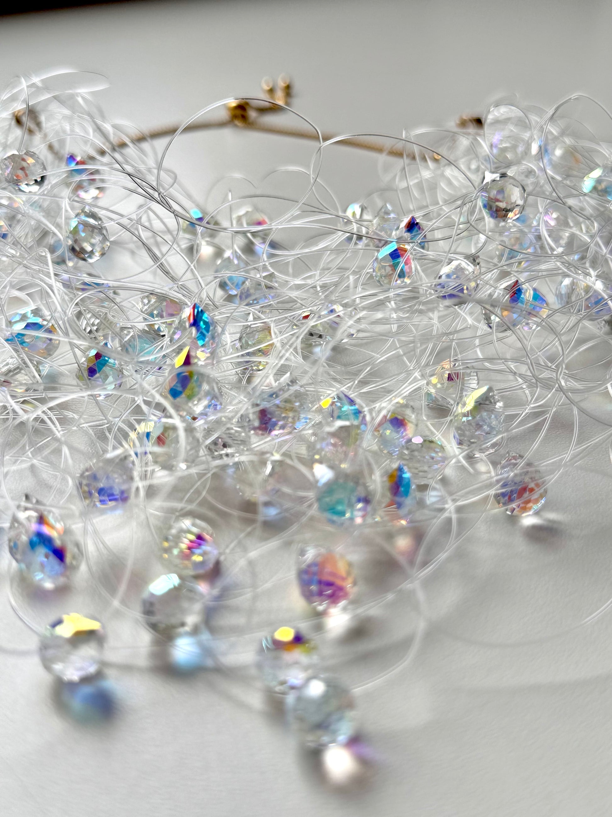 Realizzata con sottili fili di nylon trasparenti e impreziosita da gocce di cristallo iridescenti, sembra fluttuare delicatamente sulla pelle, riflettendo la luce e donando un’aura di luminosità anche al viso.