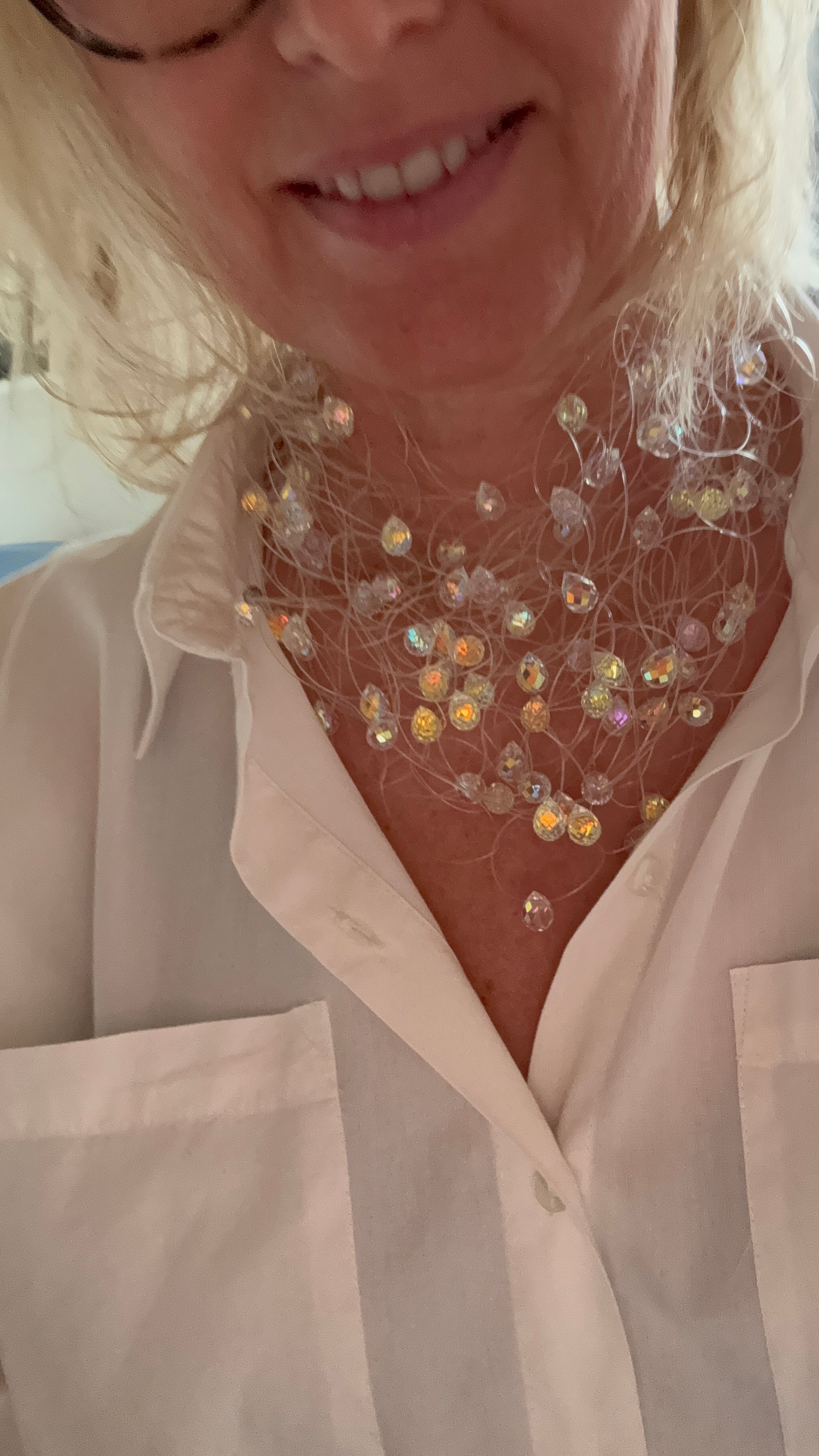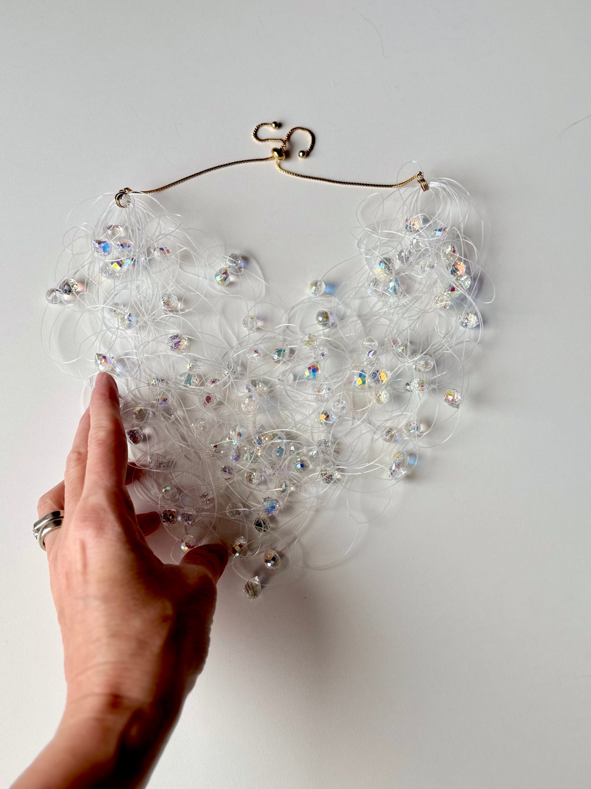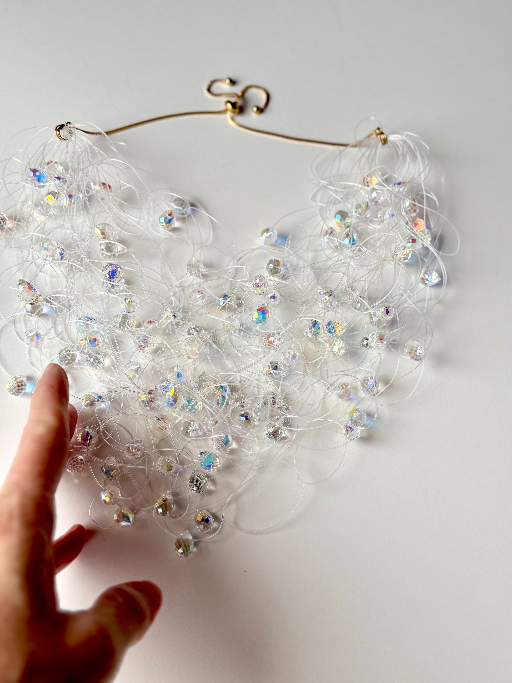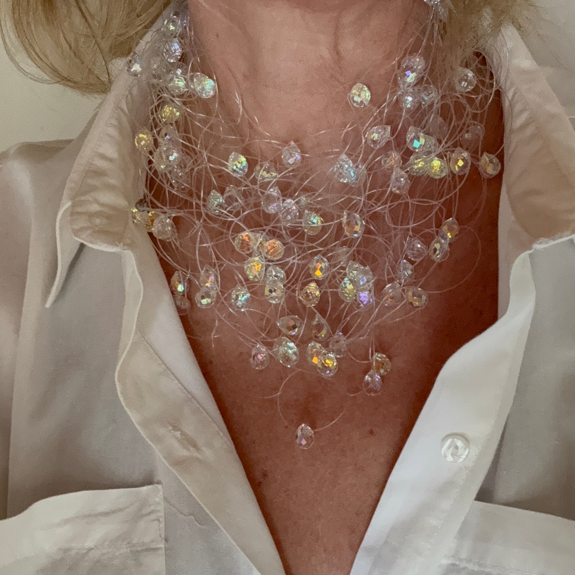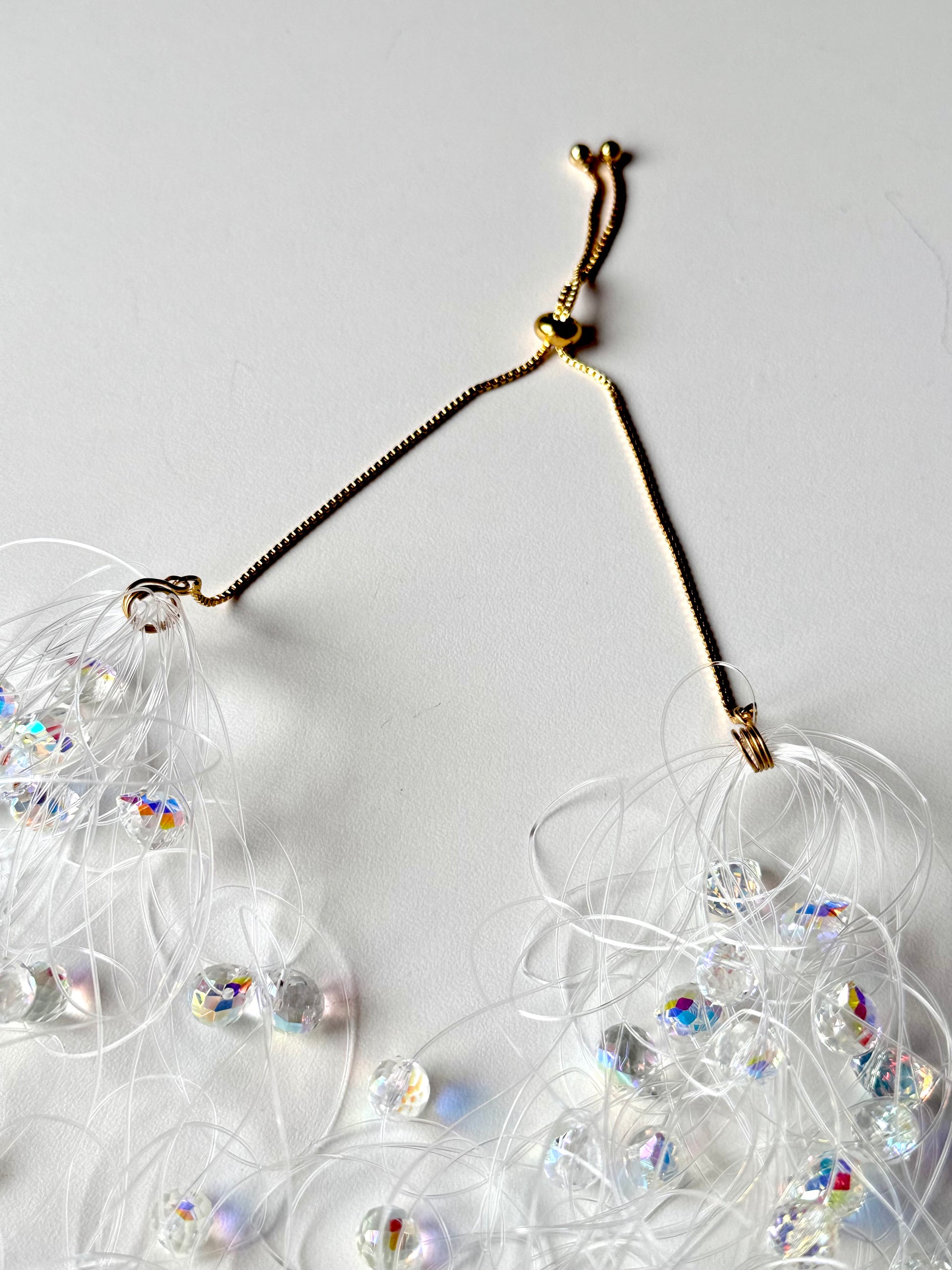 Realizzata con sottili fili di nylon trasparenti e impreziosita da gocce di cristallo iridescenti, sembra fluttuare delicatamente sulla pelle, riflettendo la luce e donando un’aura di luminosità anche al viso.