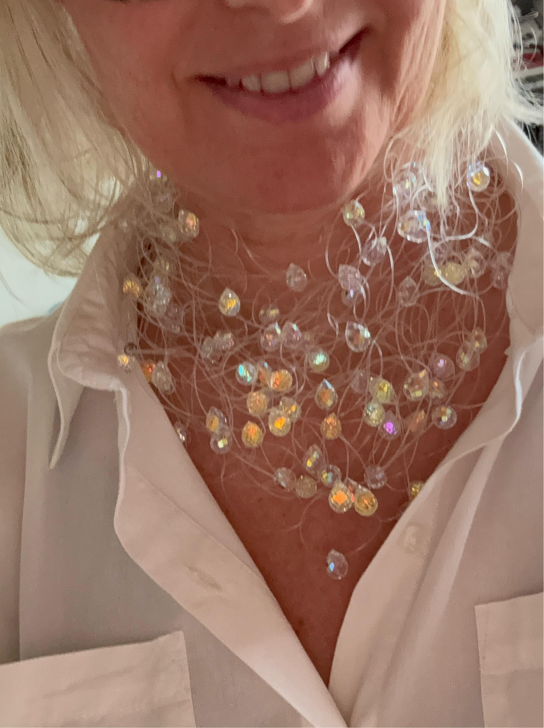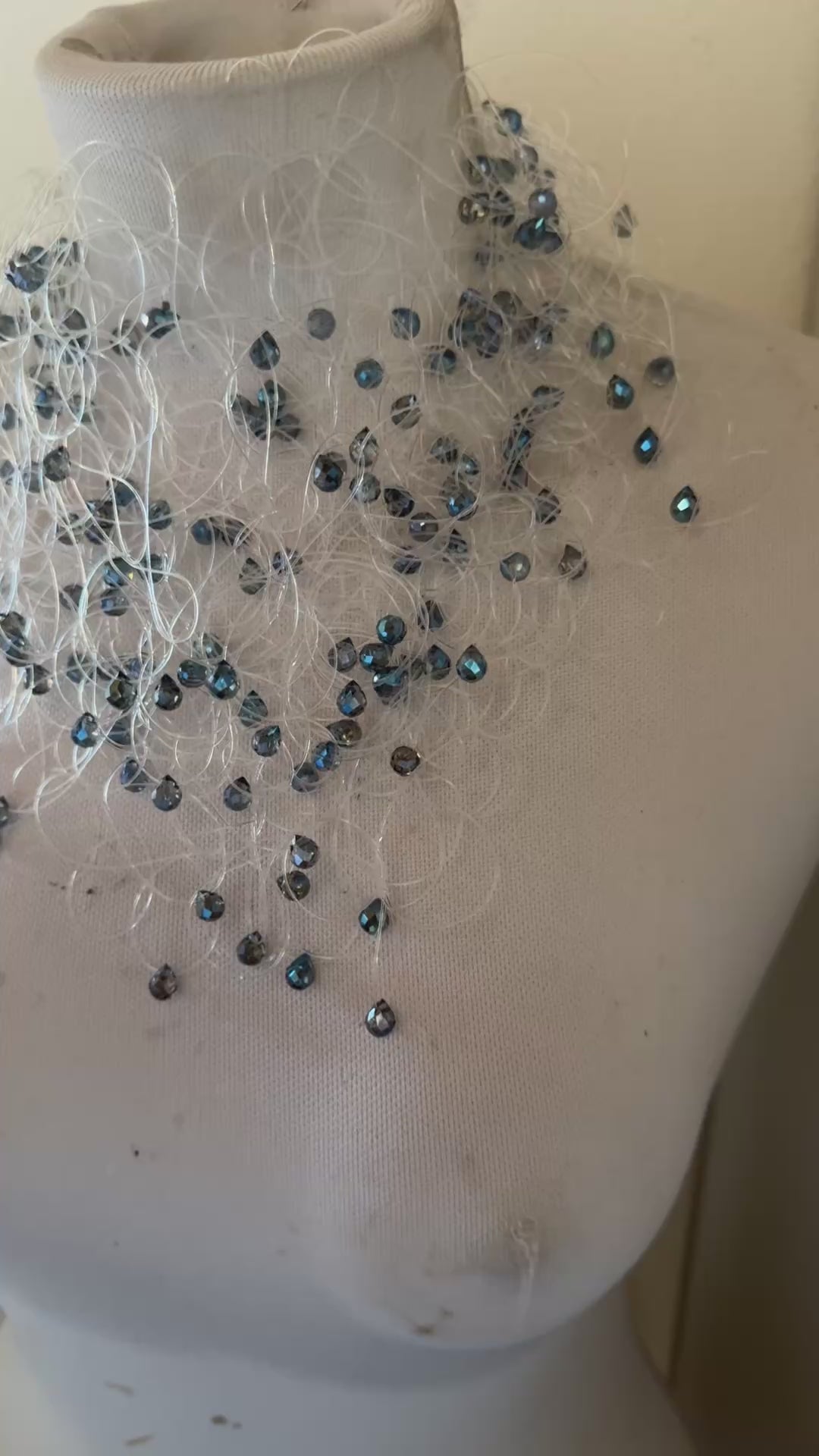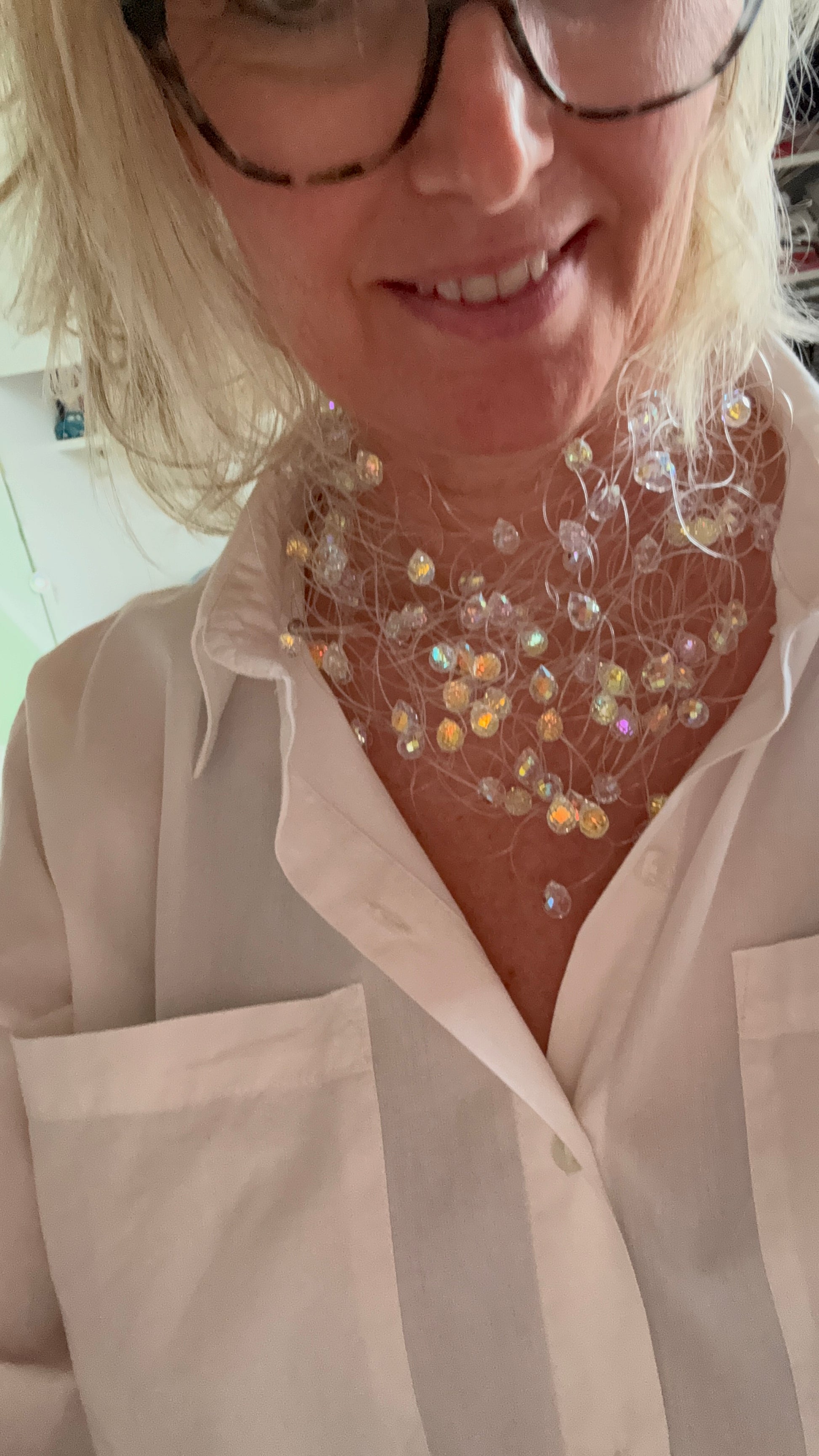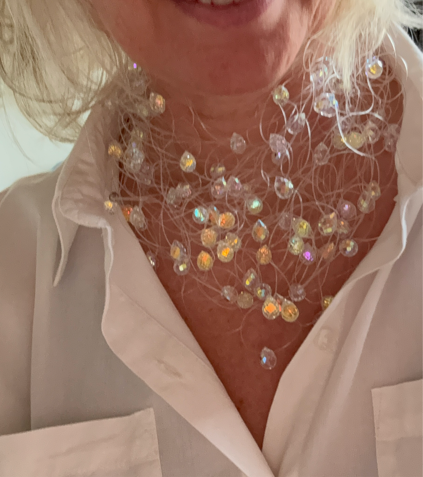 Realizzata con sottili fili di nylon trasparenti e impreziosita da gocce di cristallo iridescenti, sembra fluttuare delicatamente sulla pelle, riflettendo la luce e donando un’aura di luminosità anche al viso.