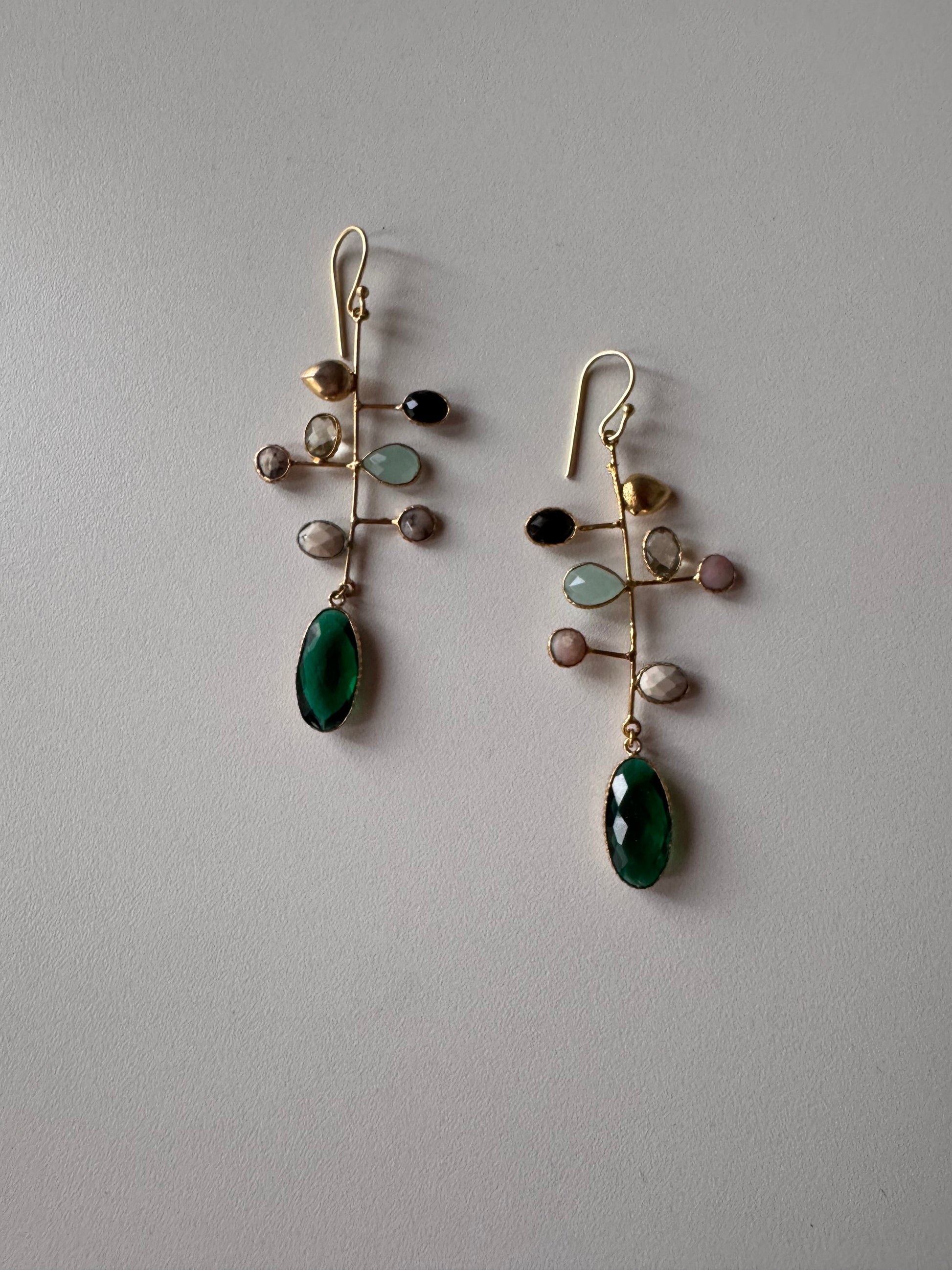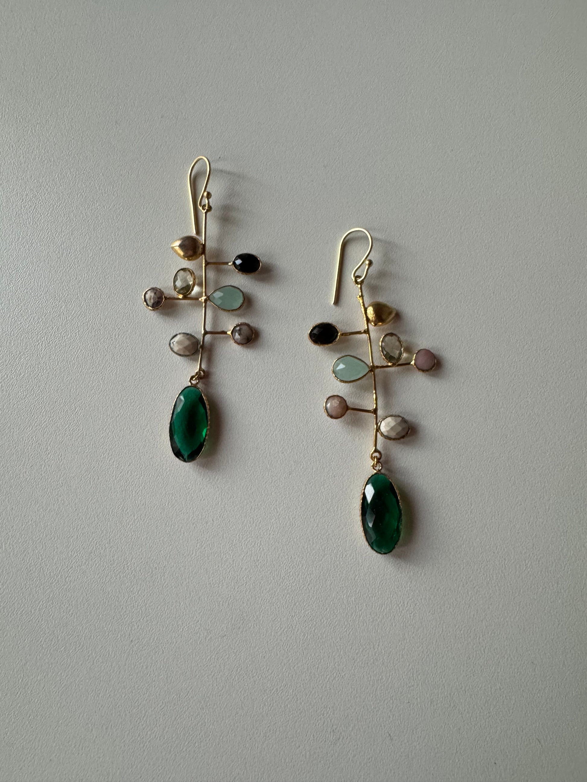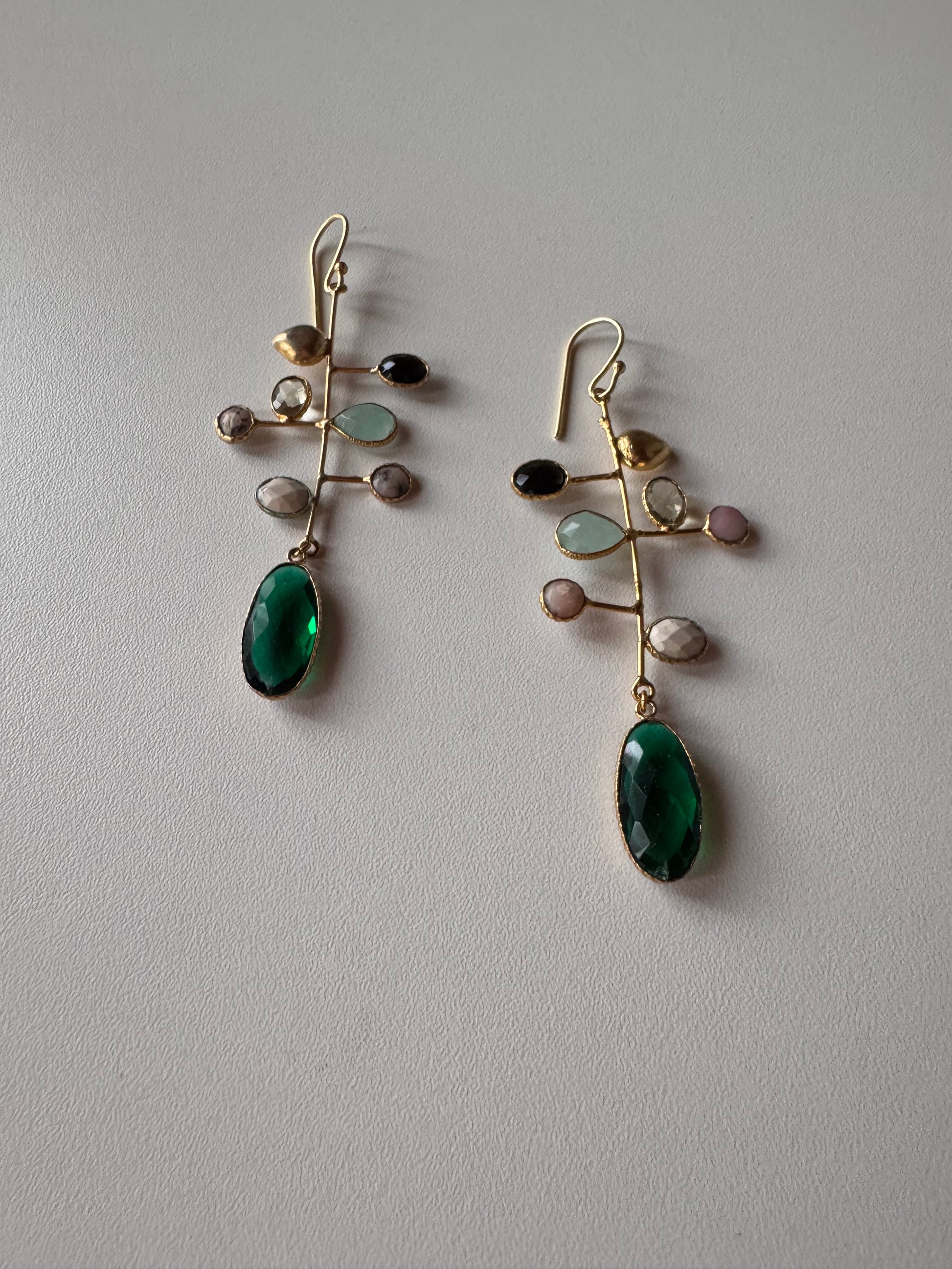 Questi orecchini pendenti, in ottone dorato, uniscono cristalli e pietre dure in una composizione divertente, capace di catturare la luce e lo sguardo.