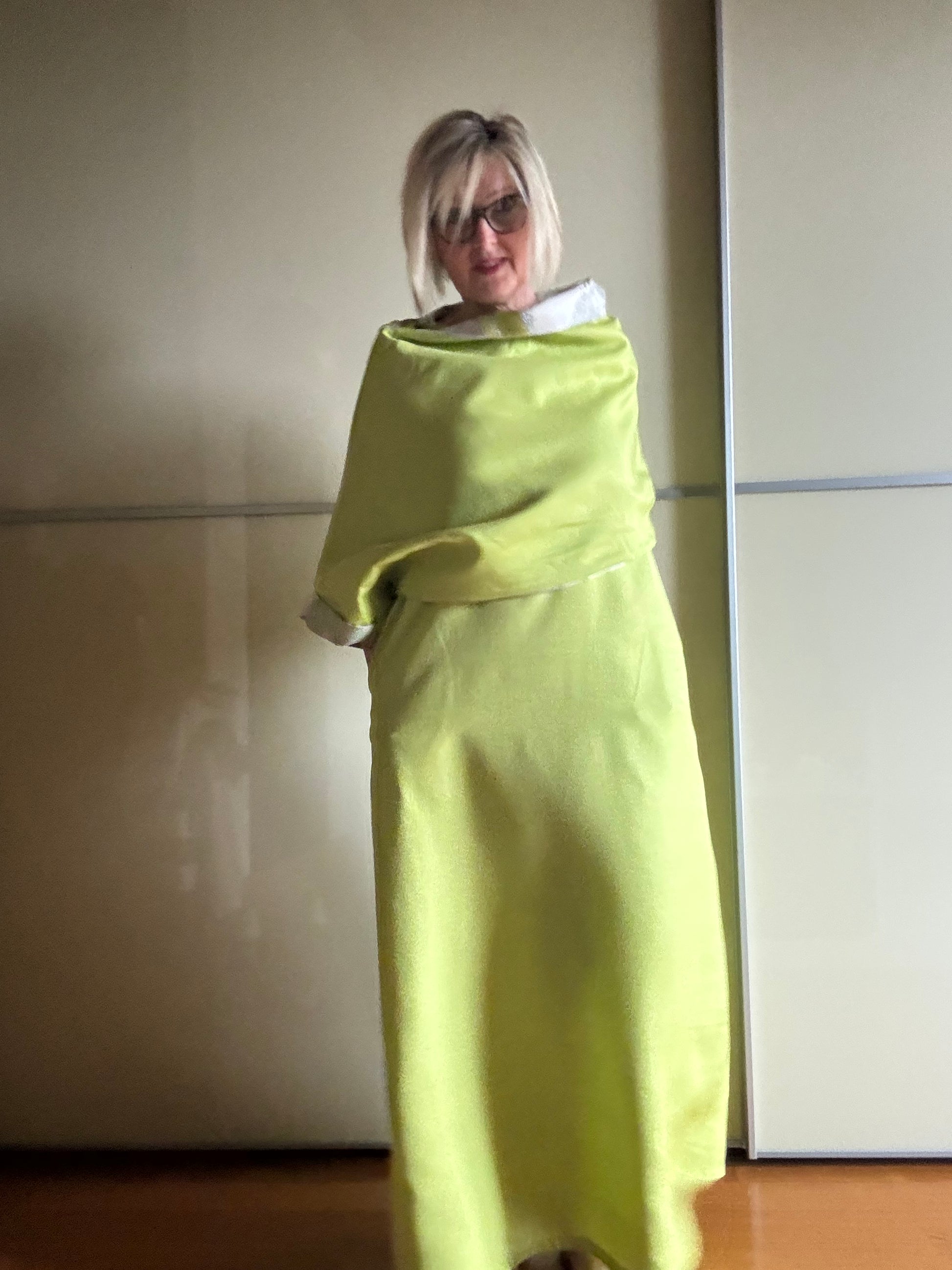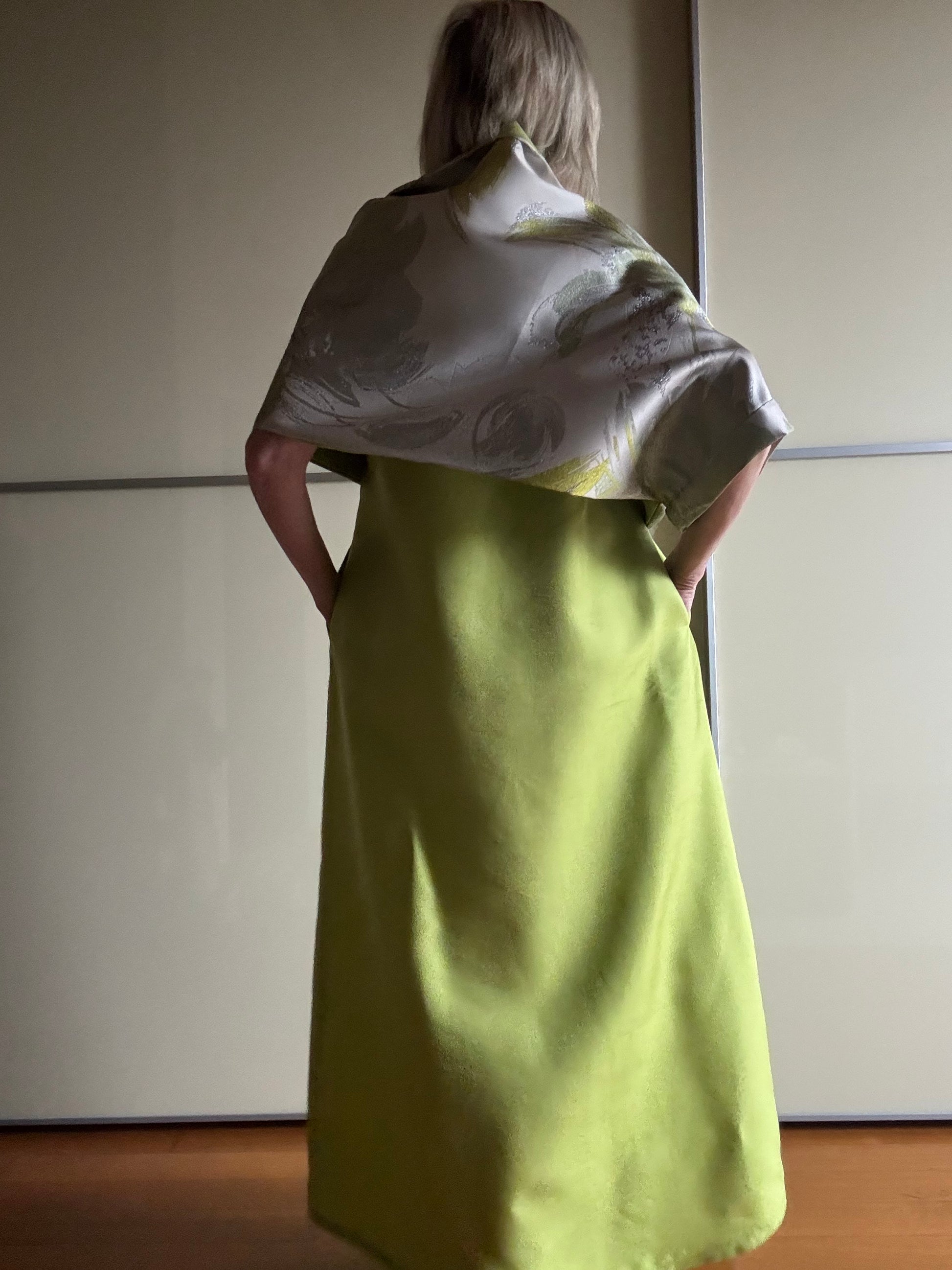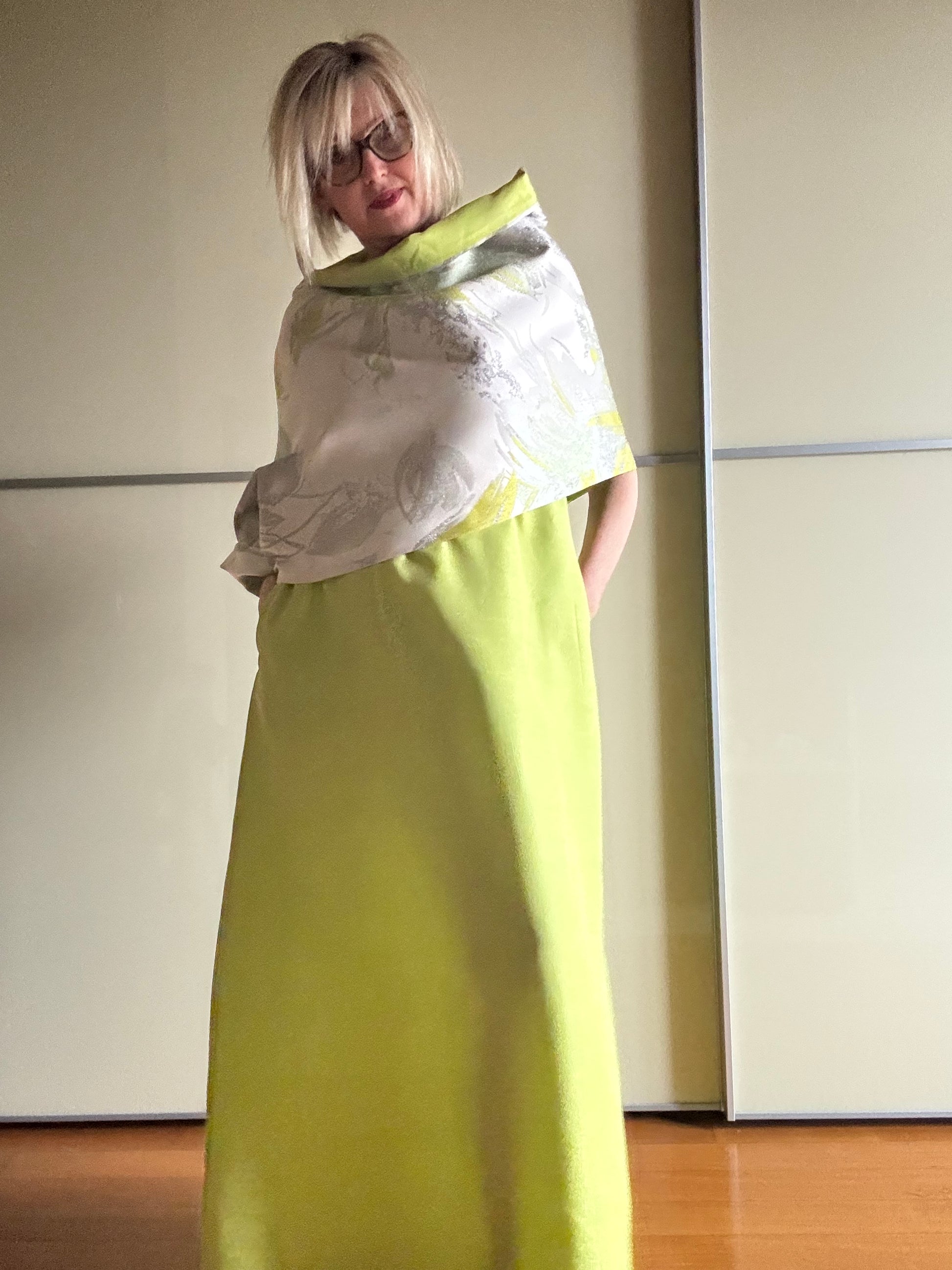 Una cappa unica, reversibile: da un lato in broccato misto seta, dall’altro in pura seta color lime come l’abito