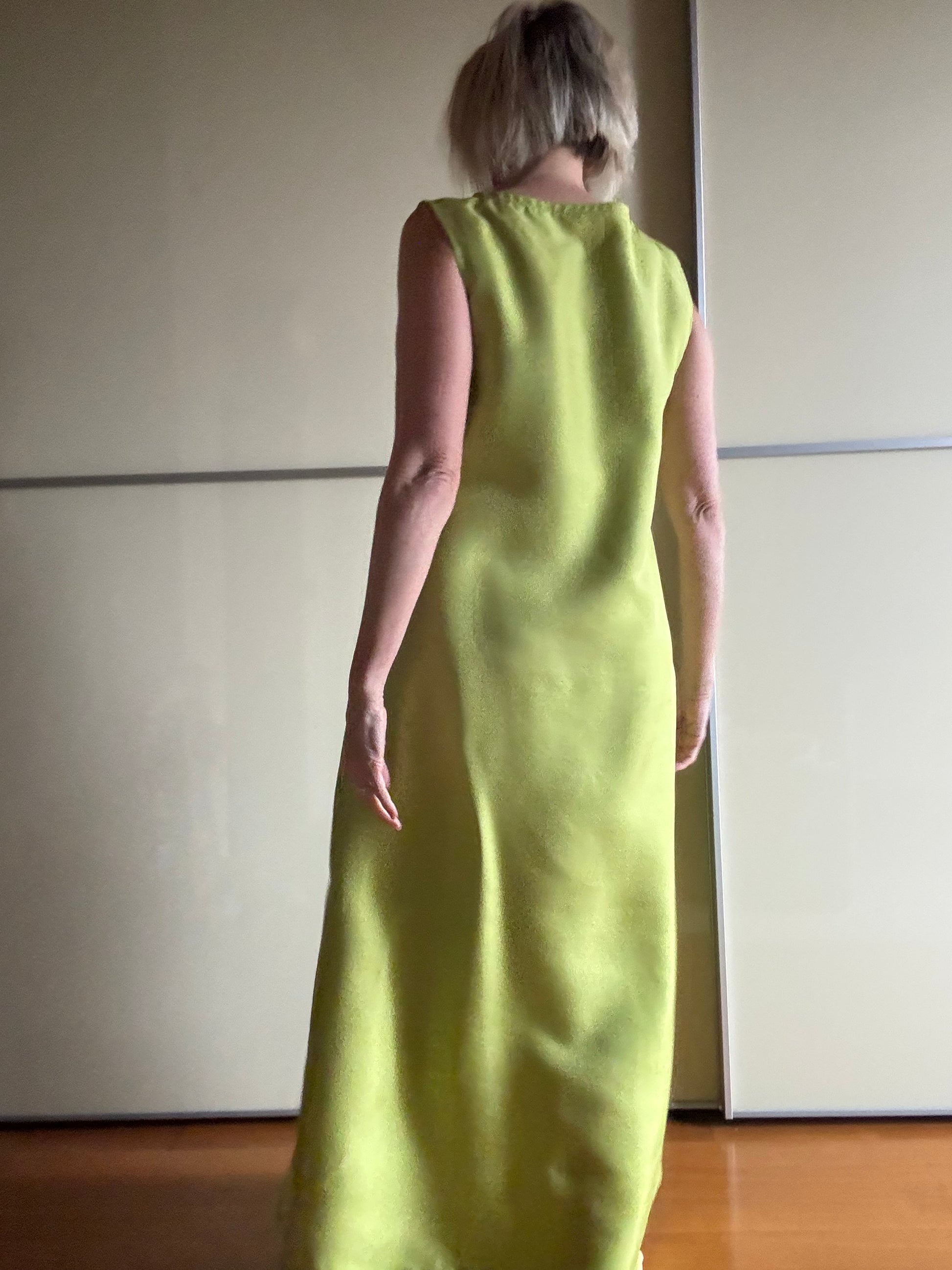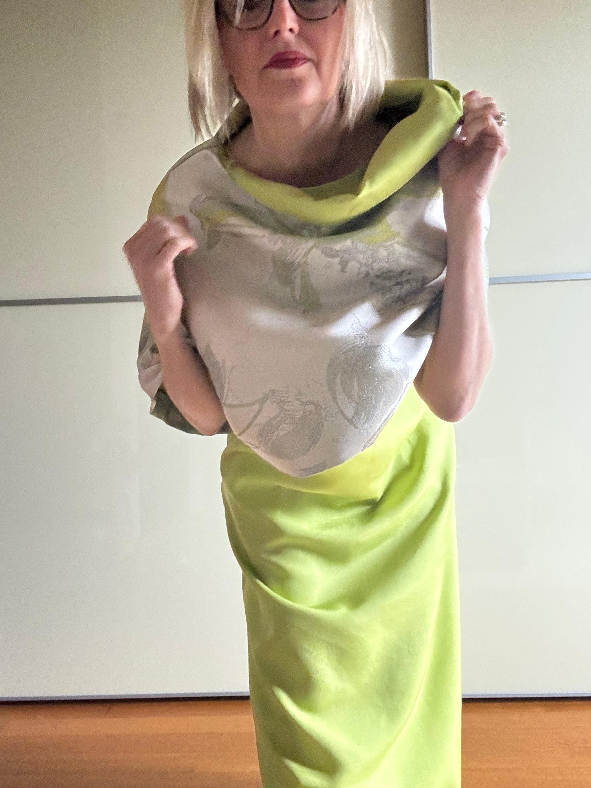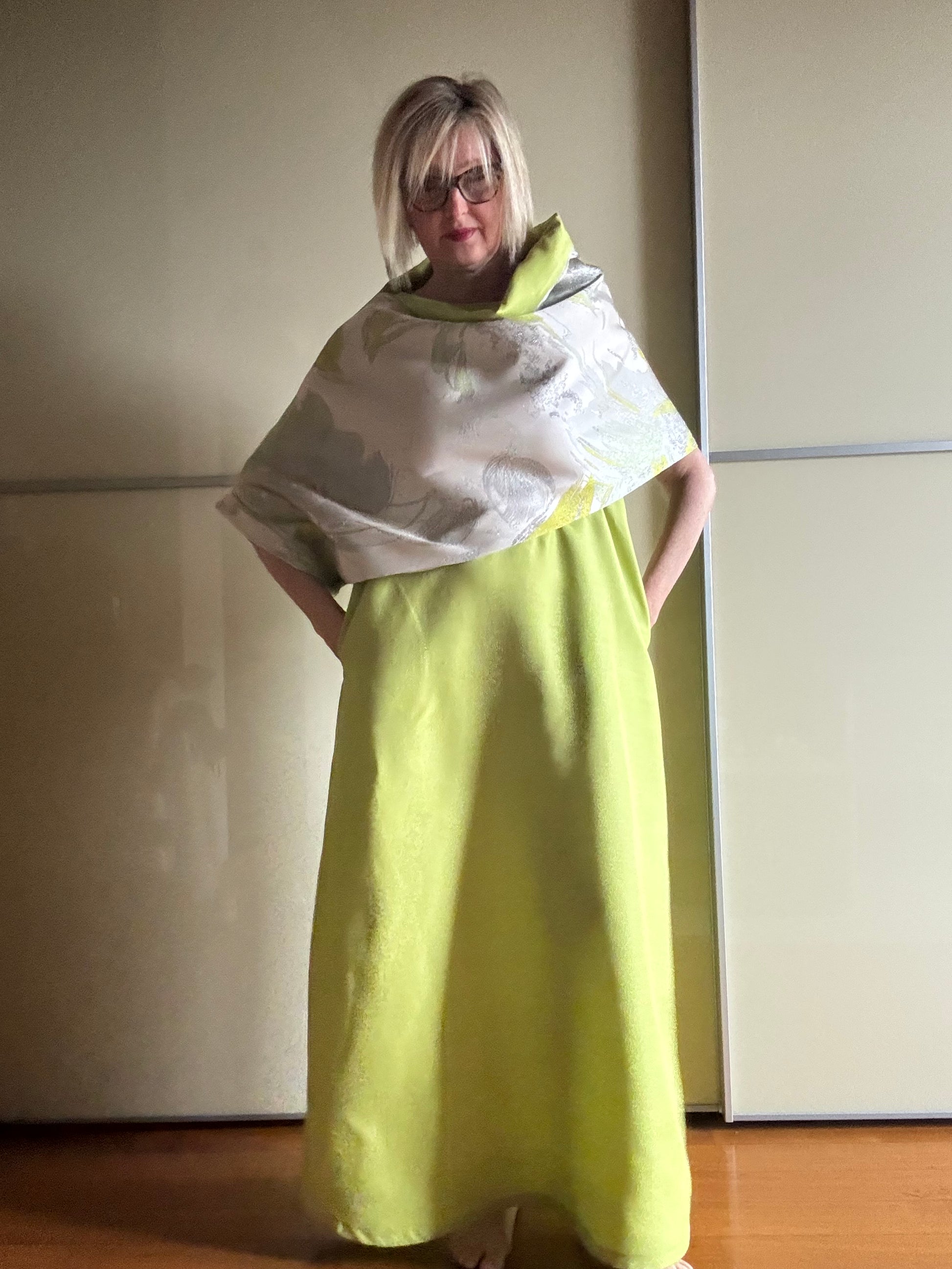 Una cappa unica, reversibile: da un lato in broccato misto seta, dall’altro in pura seta color lime come l’abito