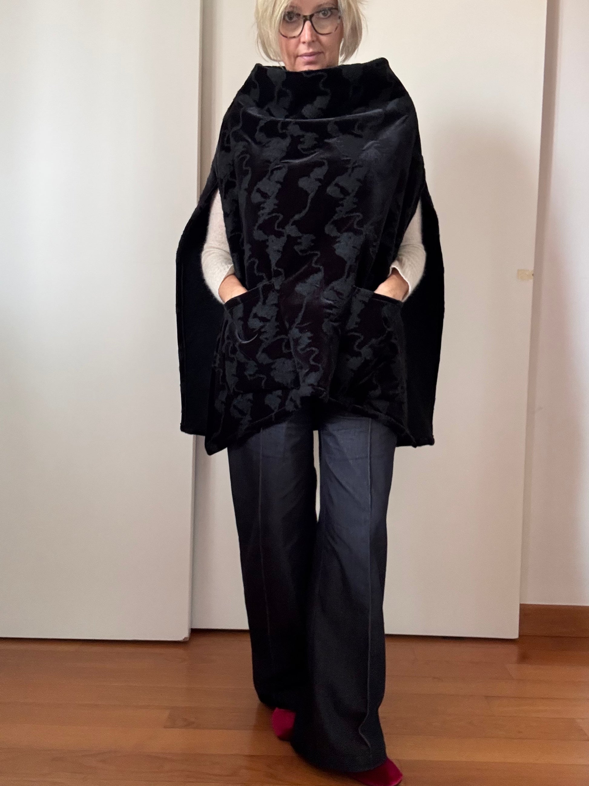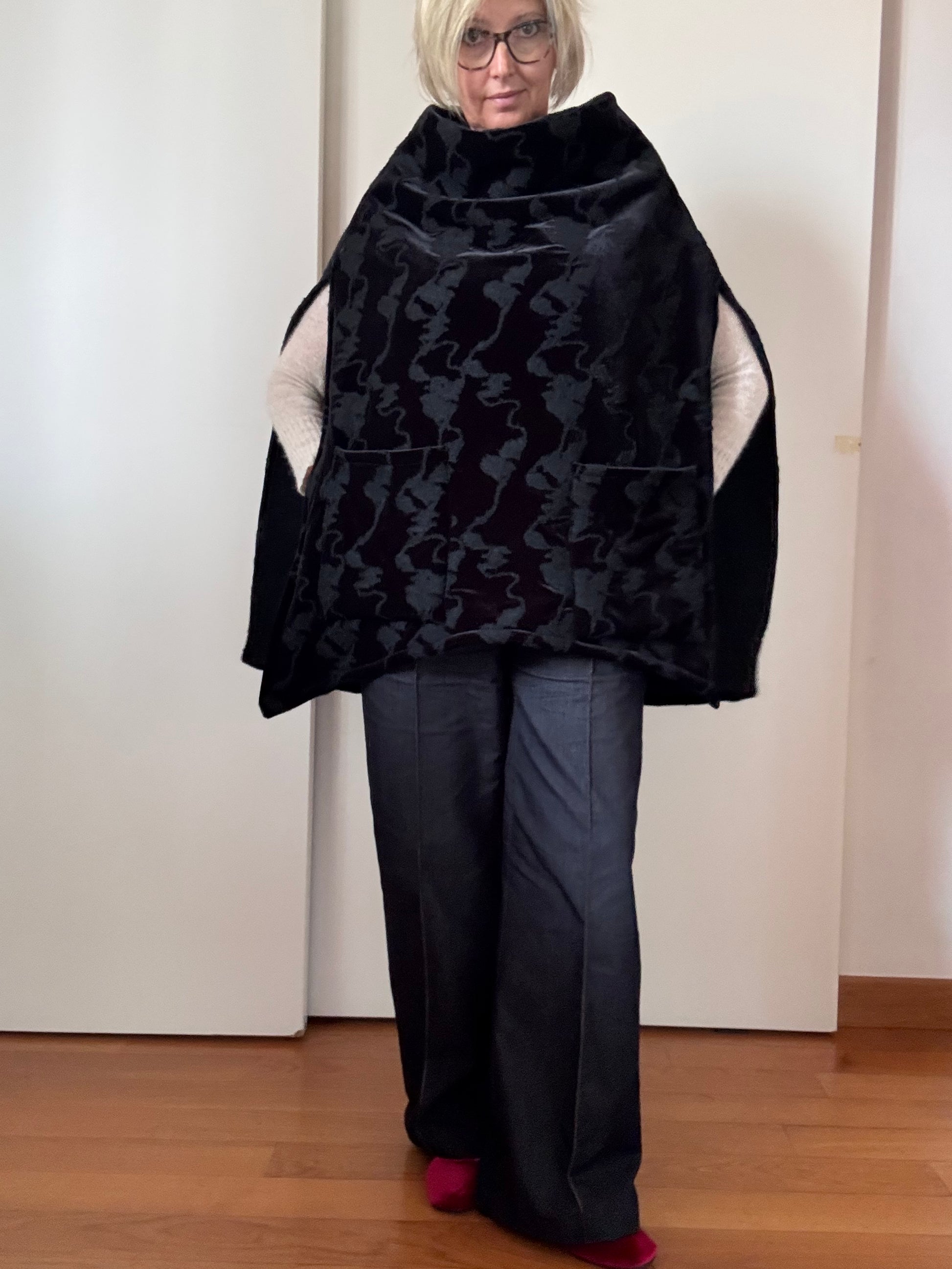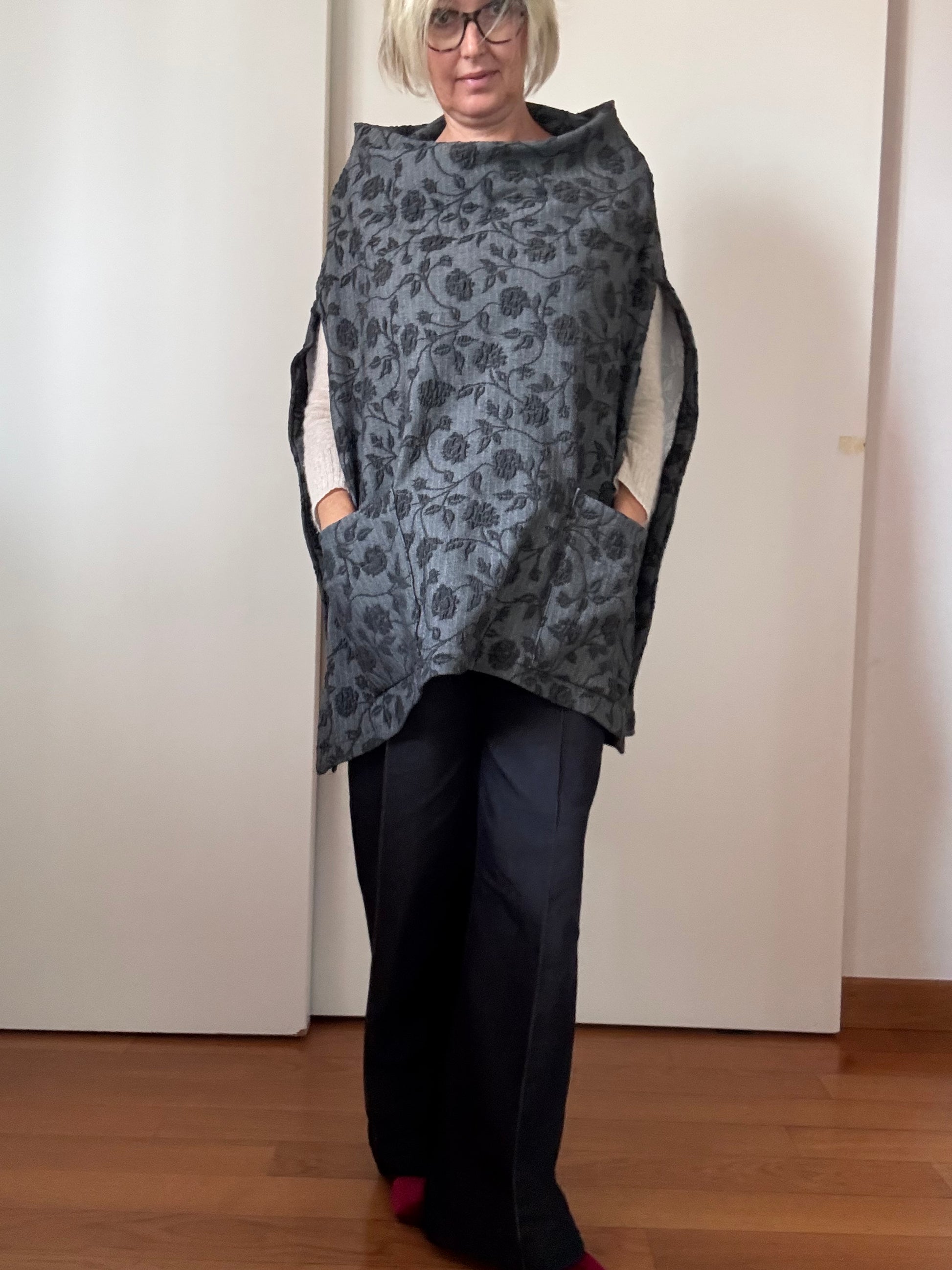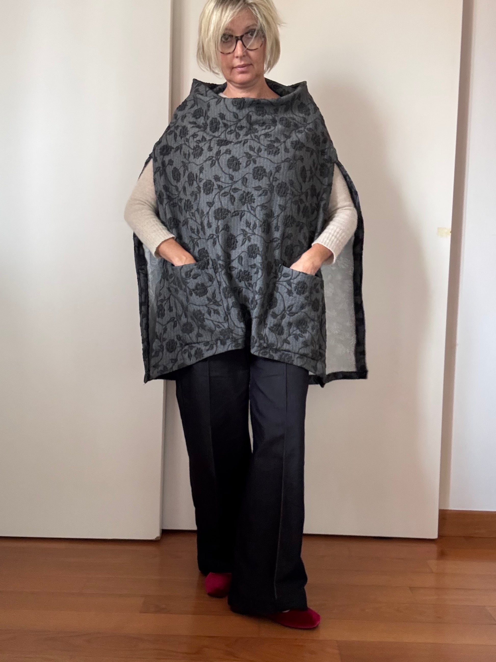 Leggera e versatile, questa cappa è realizzata in jersey pesante fiorato nei toni del grigio. La stampa floreale la rende più informale e quotidiana, mantenendo però la raffinatezza della linea. È la scelta ideale per chi cerca un capo morbido e pratico, adatto anche a stagioni più miti.