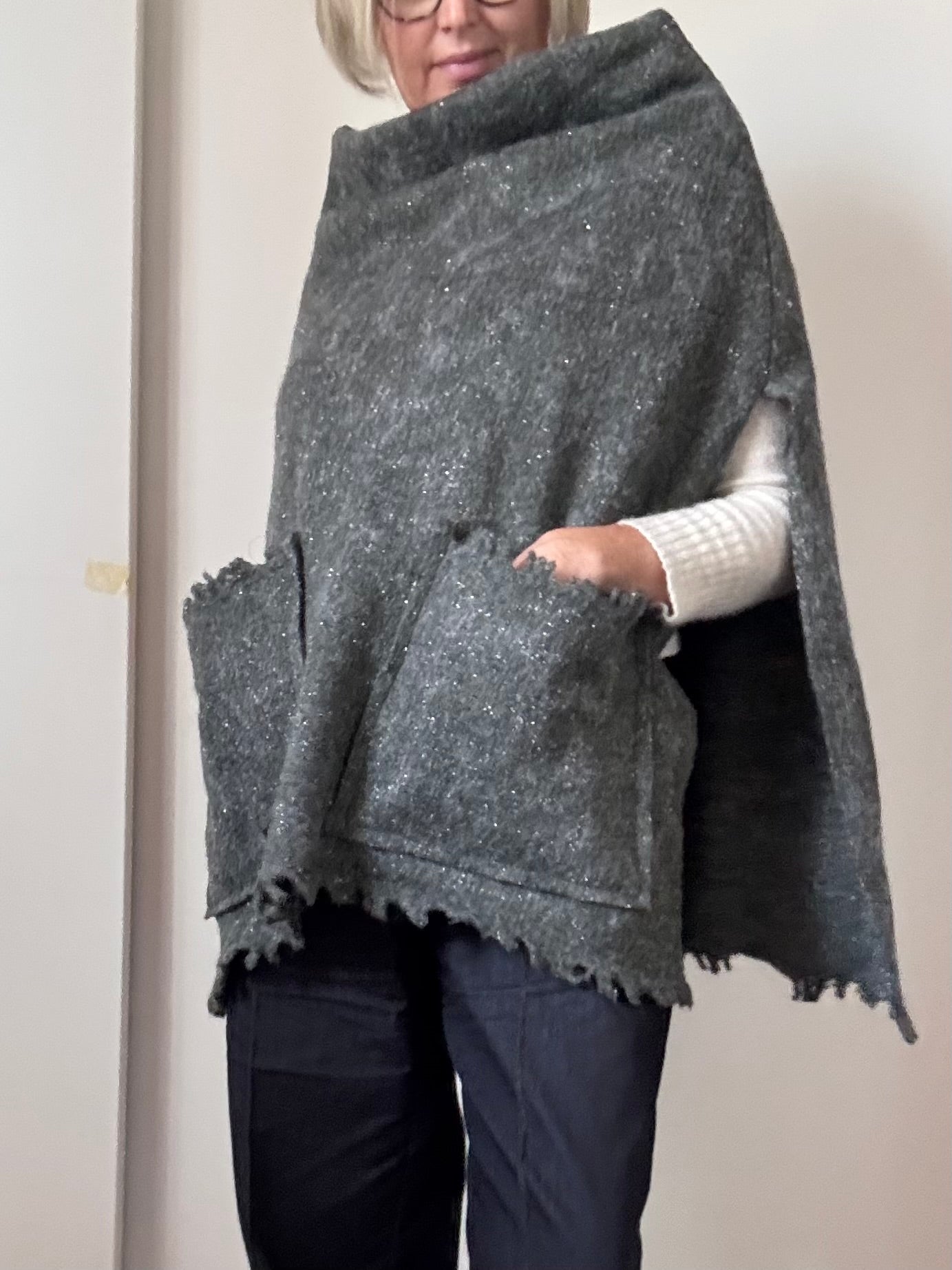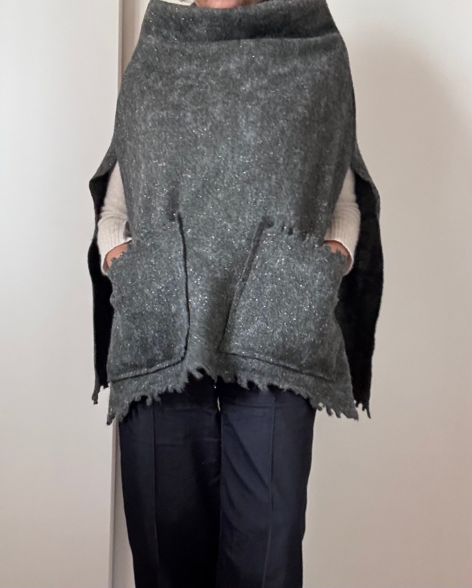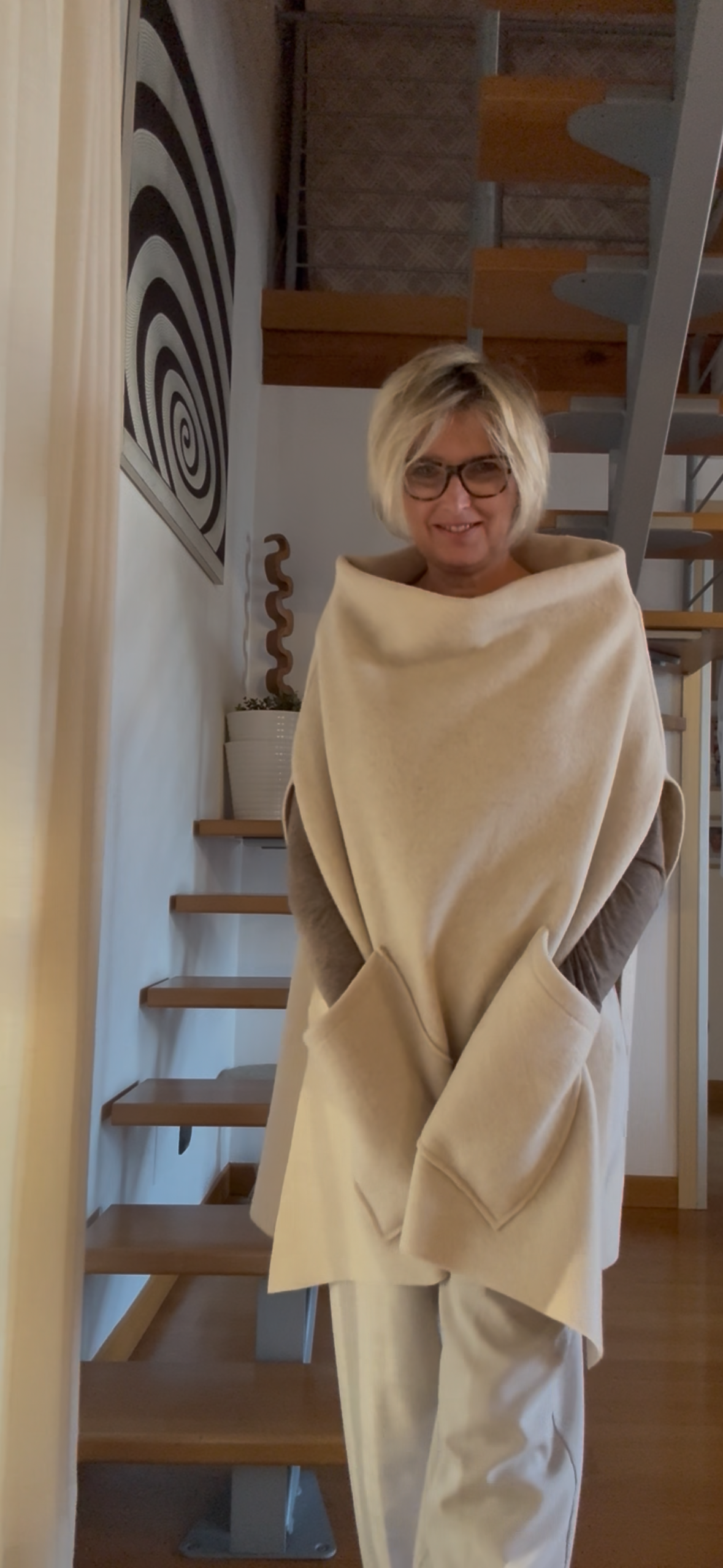 La cappa è un capo versatile e raffinato, pensato per avvolgere senza costringere. Il modello si distingue per i grandi spacchi laterali, che lasciano le braccia libere nei movimenti, e per il caratteristico scollo a cratere, un dettaglio che dona personalità ed eleganza anche alle versioni più sportive.