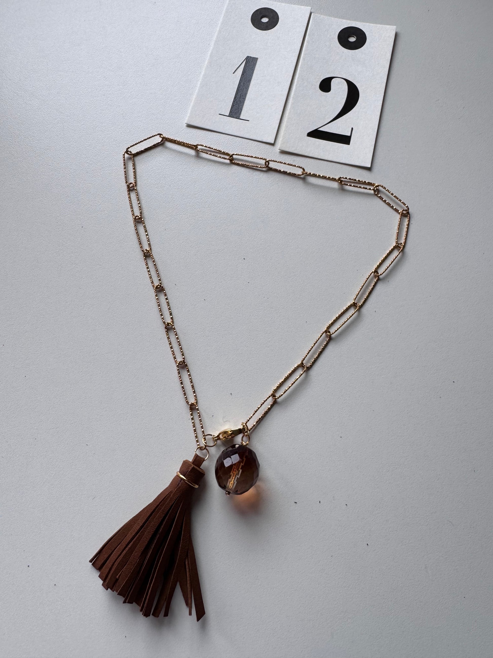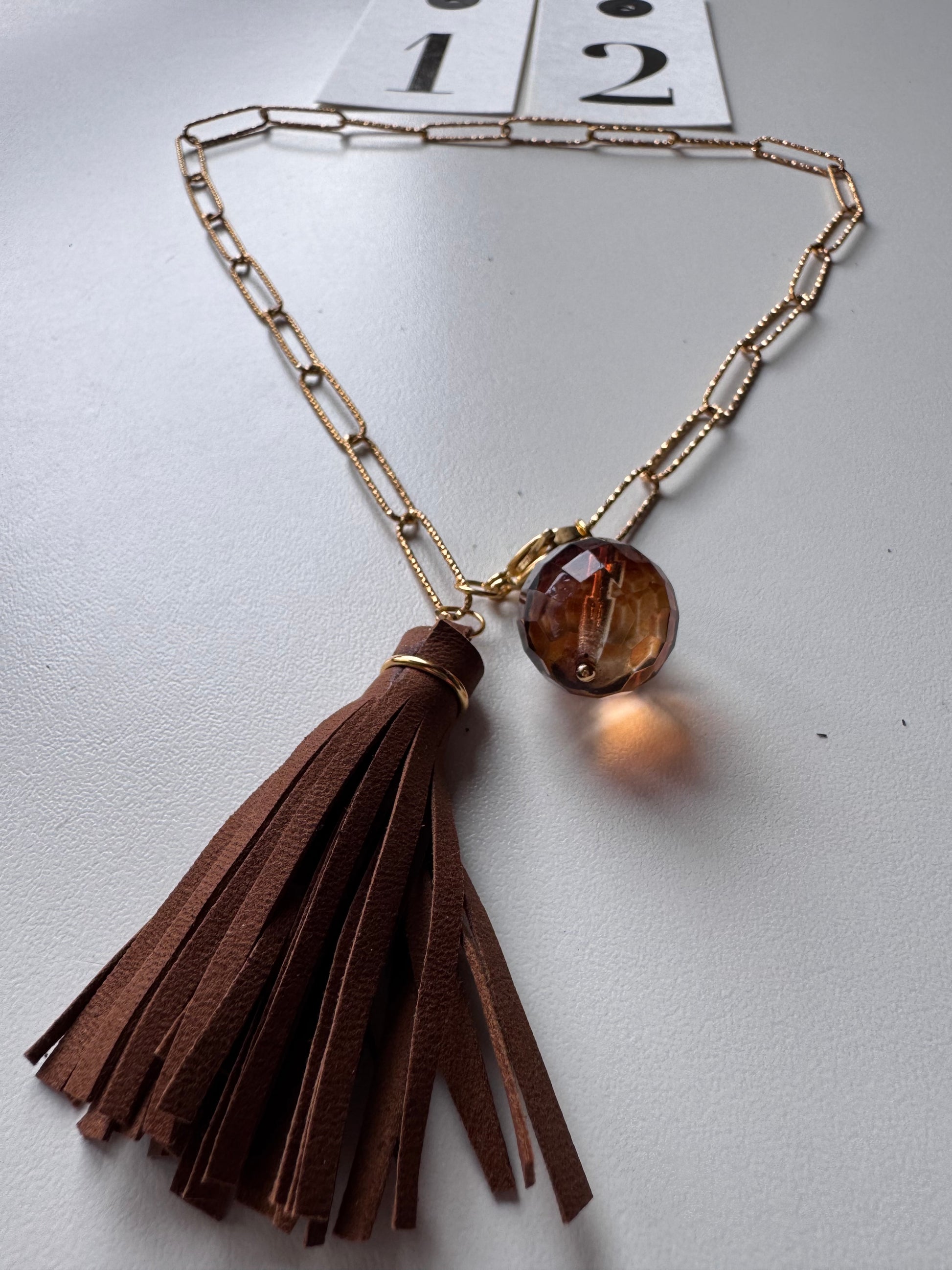 Catena in acciaio con terminale maxi cristallo fume toni ambrati per la nappina in pelle cuoio