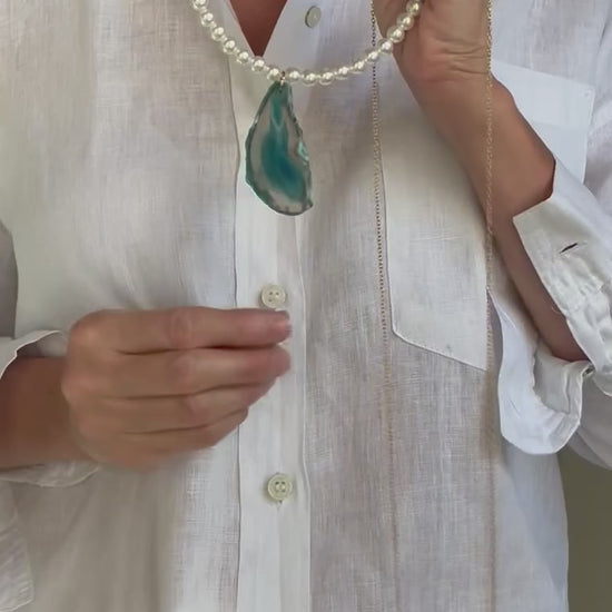 Una combo chi ama giocare con gli abbinamenti: la collana corta a cerchio armonico rivestita di perle in resina incontra la collana lunga in catena dorata, arricchita da una maxi perla centrale, e un dettaglio di agata colorata.